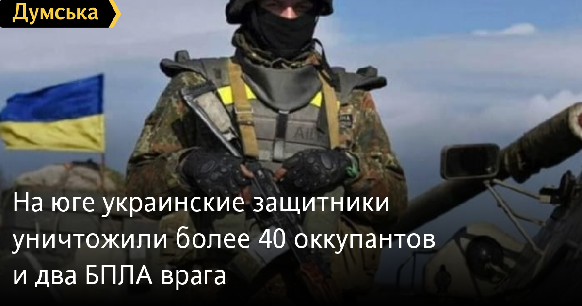 На півдні українські захисники знищили понад 40 окупантів і два БПЛА ворога44 російських окупанта і десятки одиниць ворожої техніки знищили українські захисники за минулу добу на півдні країни. Як повідомили в Оперативному командуванні «Південь», наша авіація нанесла 99 дарів по противнику, ракетно-артилерійські підрозділи виконали 246 вогневих завдань. Втрати ворога склали: 44 особи, дві реактивні системи залпового вогню «Град», чотири танки, десять одиниць авто-бронетехніки, чотири міномети 120 калібру. Також пошкоджено два танки, дві бронемашини, самохідна гаубиця «Мста-С». Окрім того, наші протиповітряні сили знищили два безпілотні літальні апарати «Орлан-10» в Миколаївському районі. СМЕРТЬ РОСІЙСЬКИМ ОКУПАНТАМ! Помітили помилку? Виділяйте слова з помилкою та натискайте control-enter |