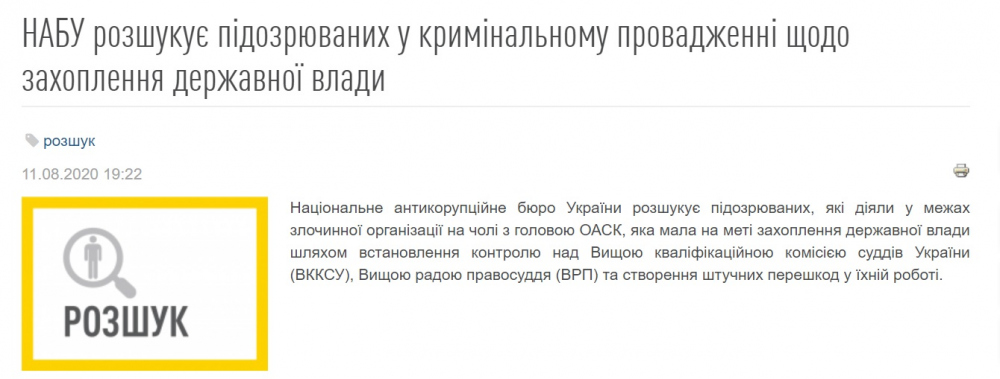Национальное антикоррупционное бюро Украины объявило в розыск шестерых судей и председателя ОАСК Павла Вовка. Об сообщила пресс-служба НАБУ. «Национальное антикоррупционное бюро Украины разыскивает подозреваемых, которые действовали в пределах преступной организации во главе с председателем ОАСК, которая имела целью захват государственной власти путем установления контроля над Высшей квалификационной комиссией судей Украины (ВККСУ), Высшим советом правосудия (ВСП) и создание искусственных препятствий в их работе», — говорится в сообщении. Напомним, 17 июля детективы НАБУ сообщили о подозрении председателю Окружного административного суда города Киева, его заместителю и еще пяти судьям этого суда, а также председателю Государственной судебной администрации Украины. Позже о подозрениях сообщили уже 12 лицам. Председатель Окружного административного суда Киева Вовк назвал все обвинения заказом «иностранных агентов», которые якобы пытаются захватить судебную власть. СМЕРТЬ РОСІЙСЬКИМ ОКУПАНТАМ! Помітили помилку? Виділяйте слова з помилкою та натискайте control-enter |