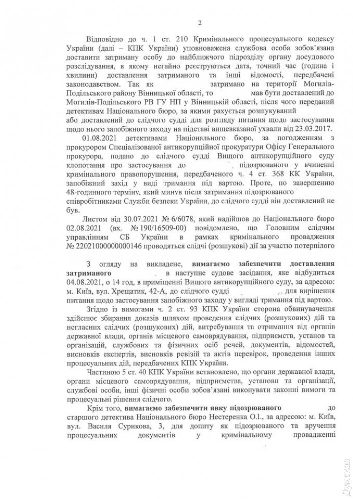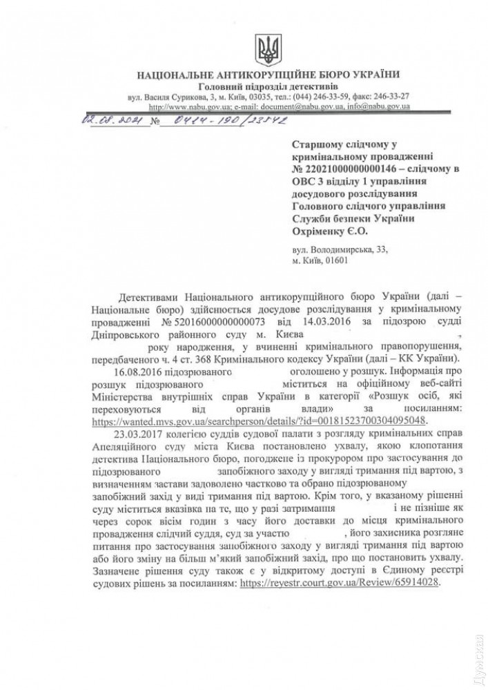 Чаус раздора: НАБУ призывает СБУ доставить подозреваемого экс-судью на заседание и перестать его скрывать (документ)Доставить на заседание бывшего судью Днепровского районного суда Киева Николая Чауса, подозреваемого в получении взятки, требуют детективы Национального антикоррупционного бюро от Службы безопасности Украины. На сайте бюро обнародовано официальное обращение. «Сокрытие сотрудниками СБУ от детективов НАБУ информации о местонахождении экс-судьи Днепровского райсуда Киева, подозреваемого в получении неправомерной выгоды, является фактическим содействием в уклонении от уголовного судопроизводства и может содержать признаки преступления в виде превышения служебных полномочий», — сообщают в НАБУ. Детективы убеждены, что сотрудники СБУ фактически укрывают подозреваемого, игнорируя требования законодательства передать разыскиваемое лицо уполномоченному органу досудебного расследования. По мнению НАБУ, они и есть этот орган. Завтра Высший антикоррупционный суд Украины должен рассмотреть ходатайство об избрании меры пресечения подозреваемому Чаусу. Детективы просят его заключить под стражу. Напомним, 30 июля Николай Чаус, которого в апреле похитили неизвестные, объявился в селе Мазуровка Винницкой области. Он пришел в здание сельсовета сам — голодный и полуголый. Какое-то время судья находился в сельсовете, где его накормили. После этого, по словам сельского головы Валерия Груньковского, приехали сотрудники СБУ и забрали Чауса с собой. После этого Национальное антикоррупционное бюро просило СБУ передать детективам Бюро задержанного судью. Через некоторое время НАБУ обнародовало видео, на котором они пытаются остановить автомобиль Службы безопасности с разыскиваемым Николаем Чаусом. Далее под здание СБУ со стороны Малоподвальной улицы приехали несколько машин с сотрудниками Национального антикоррупционного бюро. Позднее появился официальный комментарий СБУ. Следователи службы утверждают, что действовали в рамках полномочий и не нарушали законодательство. Якобы СБУ получила от Чауса данные, которые свидетельствуют о его похищении, лишении свободы и применении других незаконных действий. «Относительно господина Чауса применены меры для обеспечения его безопасности», — говорится в комментарии СБУ. — Учитывая физическое и моральное состояние после длительного лишения свободы, судье предоставляется необходимая медицинская помощь. Об этом отдельно проинформирована жена Чауса, следователи СБУ находятся в постоянном контакте с его родственниками». Напомним, об исчезновении своего подопечного в апреле этого года рассказал адвокат сбежавшего судьи Чауса Юлиан Балан. Он заявил, что Чаус был похищен в центре Кишинева группой вооруженных людей и вывезен в неизвестном направлении. Судья Чаус, напомним, попался на взятке в $150 тысяч в августе 2016 года. Полученные деньги он «законсервировал» в стеклянной банке. Погоревший на взятке служитель Фемиды воспользовался своей неприкосновенностью и смог сбежать в Молдову, где сдался полиции и попросил убежище. СМЕРТЬ РОСІЙСЬКИМ ОКУПАНТАМ! Помітили помилку? Виділяйте слова з помилкою та натискайте control-enter |