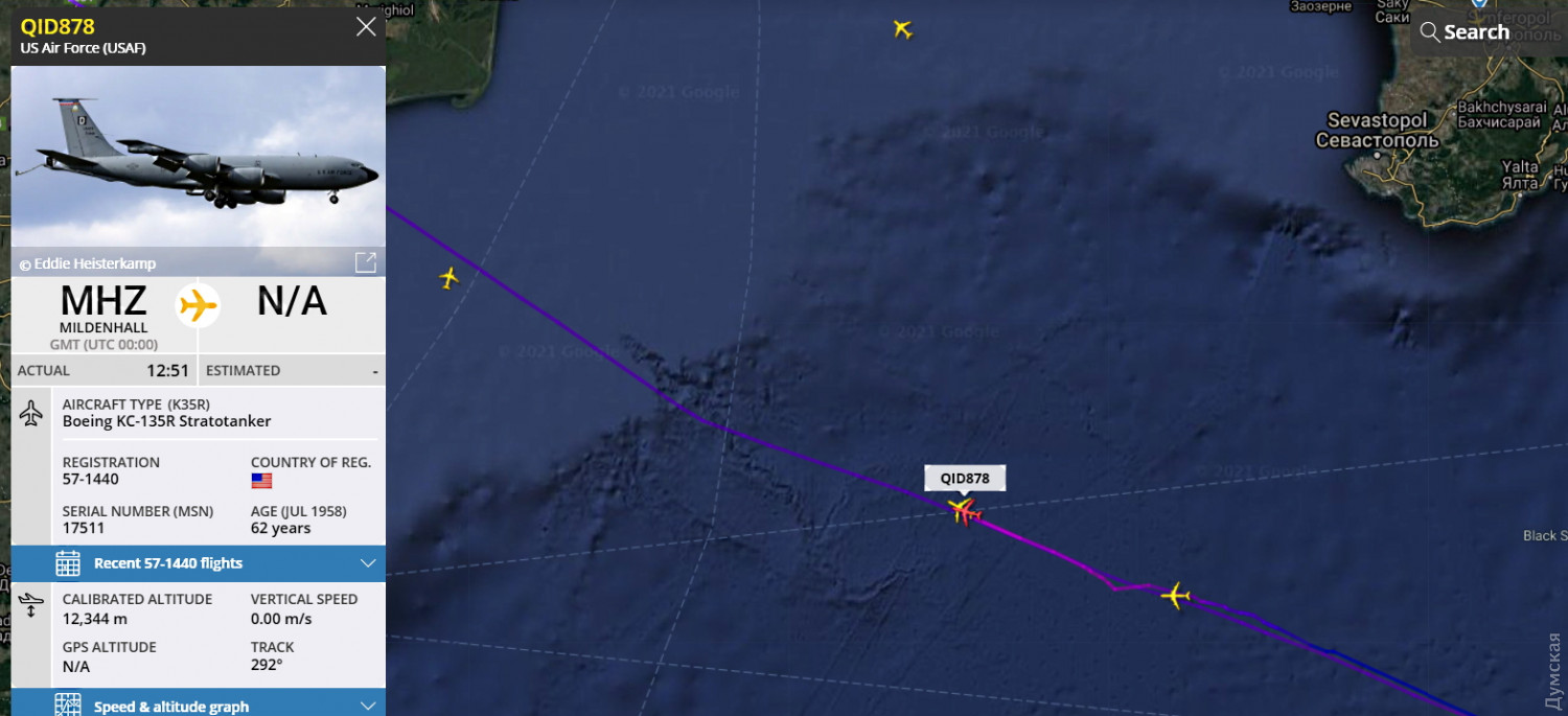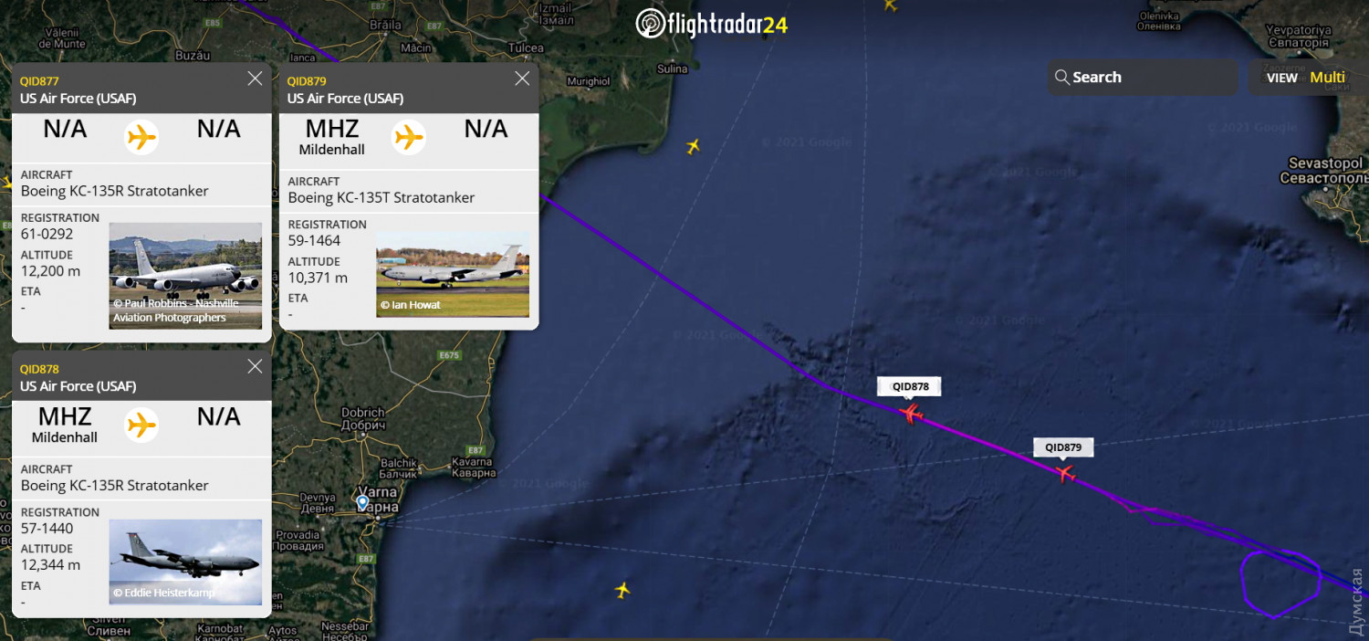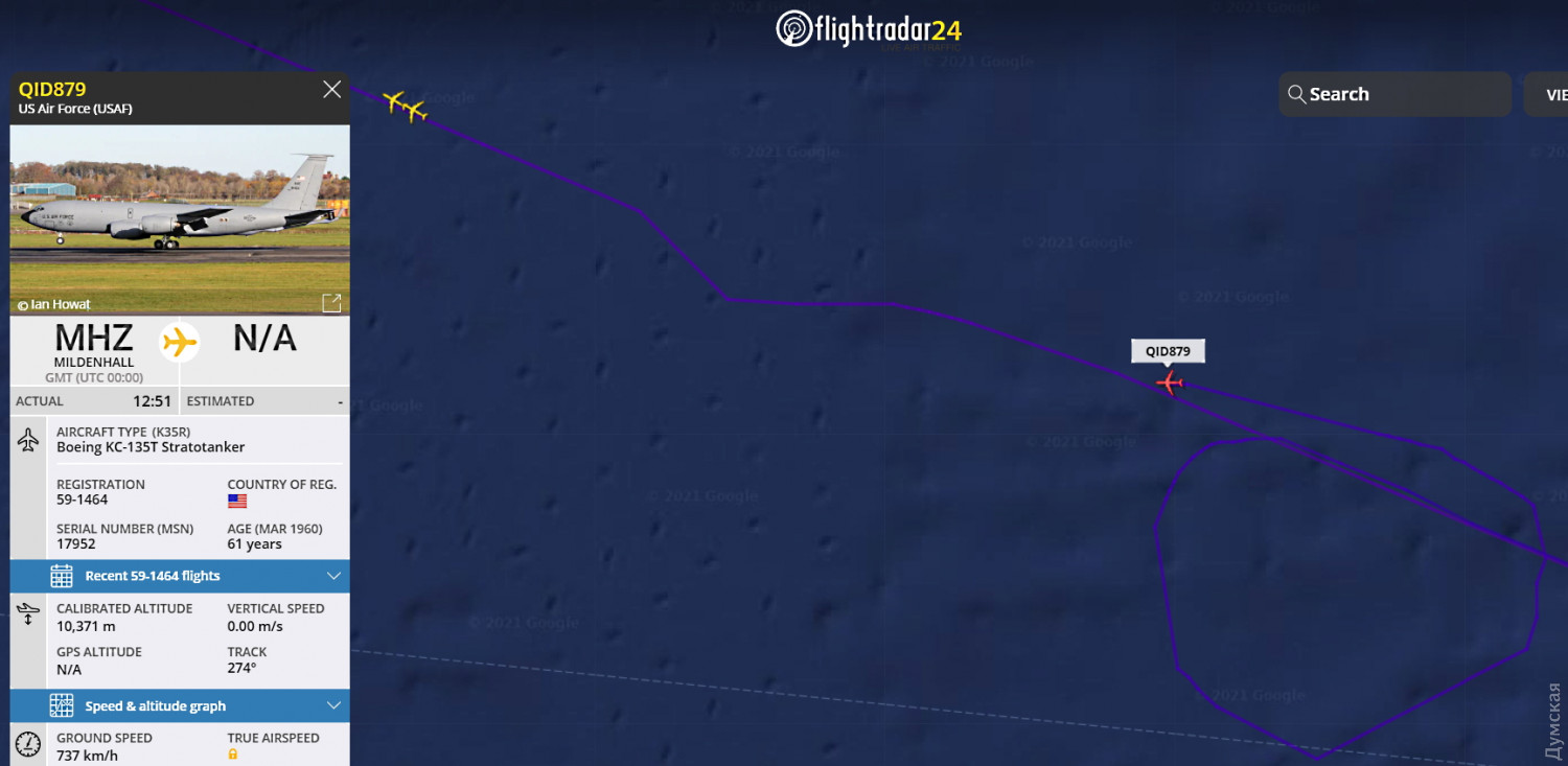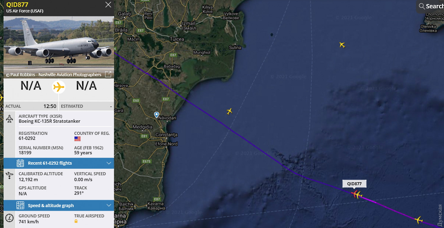 Над Черным морем в районе учений НАТО барражируют сразу три американских заправщикаСразу три американских воздушных танкера сейчас находятся над Черным морем в районе проведения международных учений «Морской щит 2021». Самолеты типа Boeing KC-135 Stratotanker днем пришли с американской авиабазы Милденхолл, что в Великобритании. Вероятно они дозаправляли палубные истребители, взлетевшие с американского авианосца «Дуайт Эйзенхауэр» (USS Dwight D. Eisenhower), находящегося сейчас в Средиземном море. Интересно, что танкеры имеют весьма солидный возраст. Старшему исполнилось 62, еще одному 61, а младшему 59 лет. Как сообщала «Думская», вчера и позавчера в Черное море вошли американские корабли из этой авианосной группы — крейсер USS Monterey CG61 и эсминец USS Thomas Hudner DDG116, чтобы принять участие в учениях. По сообщению пресс-службы Шестого американского флота, на авианосце сейчас базируется несколько эскадрилий. Самолеты F/A -18E Super Hornet из эскадрилий VFA 32, VFA 83 и VFA 105, самолеты F/A-18A/C из ударной истребительной эскадрильи VFA 131, вертолеты MH-60S из эскадрильи HSC 7, MH-60R эскадрильи HSM 74, палубные самолеты ДРЛО Е-2С «Хокай» эскадрильи VAW 123, самолеты постановки помех EA-18G «Гроулер» и транспортная эскадрилья снабжения VRC 40. По сообщению командования, в учениях принимают участие морские силы из Албании, Болгарии, Хорватии, Франции, Греции, Италии, Японии, Нидерландов, Польши, Испании, Турции, а подразделения Великобритании и Украины планируют присоединиться к участию в Sea Shield 2021. ОБНОВЛЕНО В 22:40. В группе заправщиков «затесался» еще один американский самолет. Это борт главы Пентагона, который возвращался из дипломатического турне — Индии и Афганистана. Министр обороны летел на самолете Boeing747-E4B, оснащенным комплексом спецсвязи для возможности руководить боевыми подразделениями. Из трэка понятно, что все самолеты сблизились на расстояние визуальной видимости, возможно американские истребители также присутствовали в поле видимости министра. СМЕРТЬ РОСІЙСЬКИМ ОКУПАНТАМ! Помітили помилку? Виділяйте слова з помилкою та натискайте control-enter |