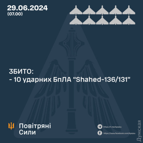 Десять ворожих Shahed збили над Україною вночі 29 червня. Запускали ударні безпілотники з району Приморсько-Ахтарськ, рф, повідомили в Повітряних силах. Збивали «пташок» за допомогою винищувальної авіації, зенітних ракетних підрозділів, розрахунків мобільних вогневих груп і засобів РЕБ Повітряних Сил ЗС України. Повітряні цілі знищено в межах Миколаївської, Херсонської, Дніпропетровської, Кіровоградської, Черкаської та Вінницької областей. СМЕРТЬ РОСІЙСЬКИМ ОКУПАНТАМ! Помітили помилку? Виділяйте слова з помилкою та натискайте control-enter |