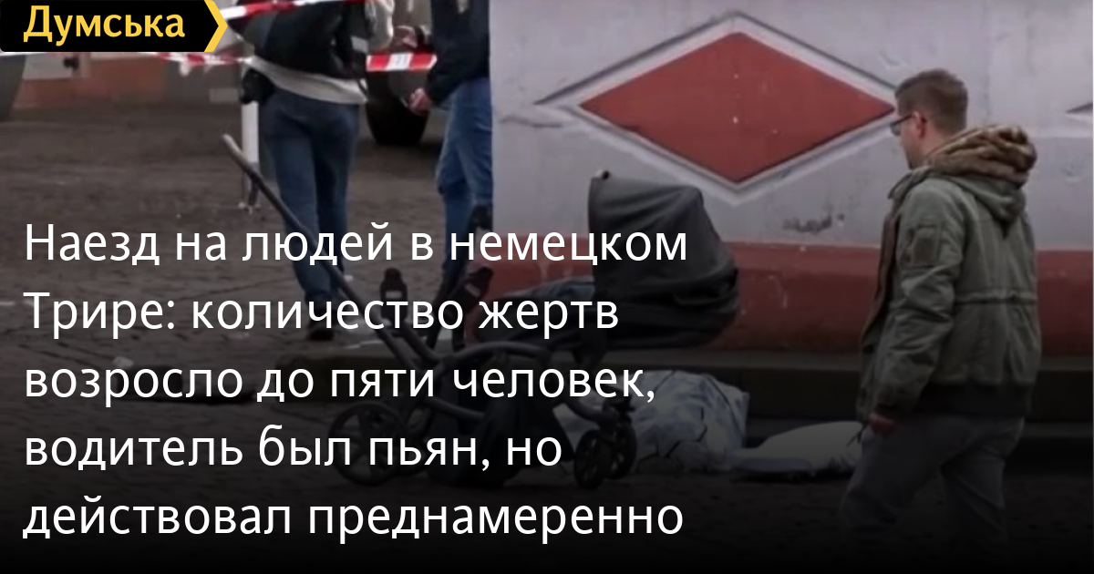 Наезд на людей в немецком Трире: количество жертв возросло до пяти человек, водитель был пьян, но действовал преднамеренноВозросло количество жертв вчерашней трагедии в немецком городе Трир. По данным Reuters, в результате ЧП погибли пять человек: женщины в возрасте 25, 52 и 73 лет, девятимесячный младенец и его отец, 45-летний мужчина. Кроме того, пострадали 14 человек, из них 9 получили тяжелые травмы. Прокурор Петер Фритцен на пресс-конференции сообщил, что виновник трагедии, действовал преднамеренно — водитель ехал зигзагом по пешеходной зоне, чтобы причинить вред как можно большему количеству людей. Задержанный 51-летний местный житель не имел судимости. В последнее время у него не была дома и он жил прямо в автомобиле. Как утверждают его знакомые, он продал родительский дом, купил внедорожник и ежедневно выпивал. У подозреваемого в крови обнаружили 1,4 промилле алкоголя. По словам прокурора, он может быть психически больным. Прокурор заявил также, что пока нет никаких оснований считать случившееся террористическим актом. СМЕРТЬ РОССИЙСКИМ ОККУПАНТАМ! Заметили ошибку? Выделяйте слова с ошибкой и нажимайте control-enter |