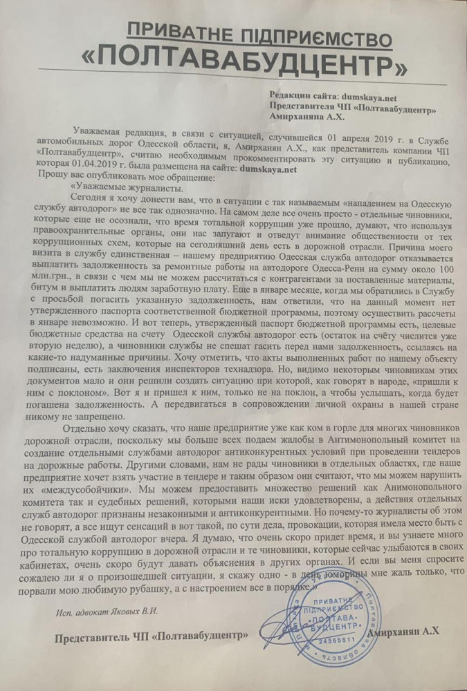 «И вот теперь утвержденный паспорт бюджетной программы есть, целевые бюджетные средства на счету Одесской службы автодорог есть (остаток на счету числится уже вторую неделю), а чиновники службы не спешат гасить перед нами задолженность, ссылаясь на какие-то надуманные причины, — сетует Амирханян. — Хочу отметить, что акты выполненных работ по нашему объекту подписаны, есть заключения инспекторов технадзора. Но, видимо, некоторым чиновникам этих документов мало и они решили создать ситуацию, при которой, как говорят в народе, «пришли к ним с поклоном». Вот я и пришел к ним, только не на поклон, а чтобы услышать, когда будет погашена задолженность. А передвигаться в сопровождении личной охраны в нашей стране никому не запрещено».