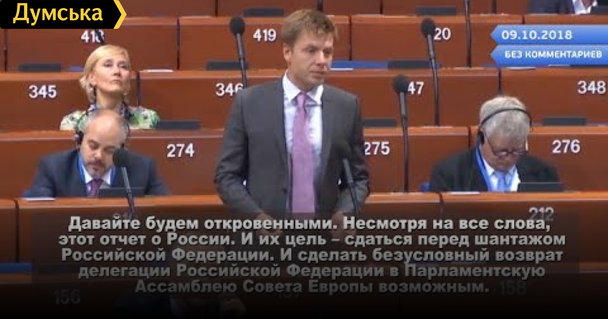 А вот генсека Ягланда Турбъёрна Члены Парламентской Ассамблеи Совета Европы встретили шумом и стуком. Норвержец известен своей пророссийской позицией. СМЕРТЬ РОСІЙСЬКИМ ОКУПАНТАМ! Помітили помилку? Виділяйте слова з помилкою та натискайте control-enter Думская ТВ. Сюжеты: