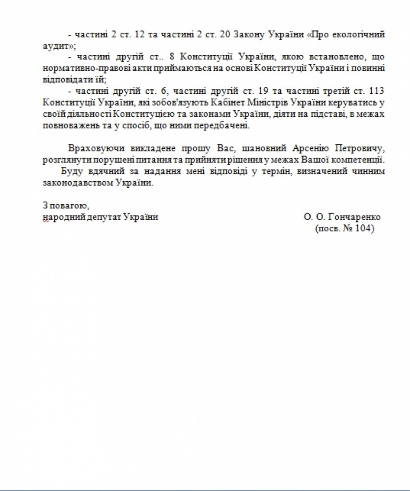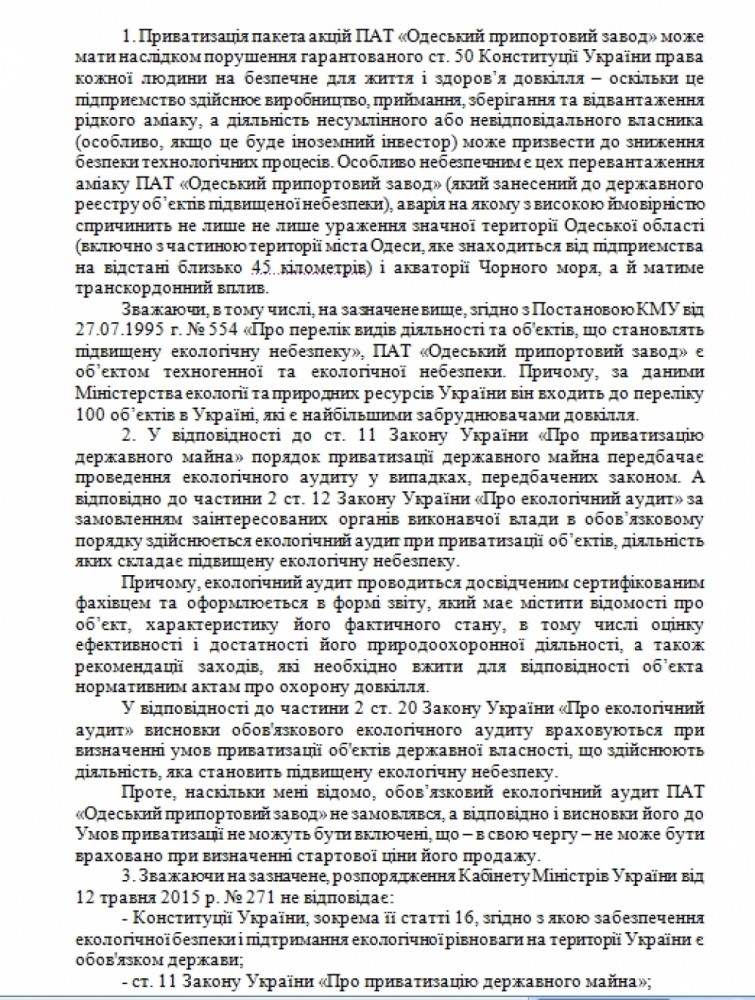 Нардеп Гончаренко выступил против приватизации Одесского припортового завода (документ)Народный депутат Украины Алексей Гончаренко просит Верховную Раду внести изменения в постановление Кабинета Министров «Про проведение прозрачной и конкурентной приватизации в 2015 году» в части исключения из перечня объектов государственной собственности, которые подлежат приватизации более 99 % пакета акций Одесского припортового завода. По мнению заместителя главы фракции Блока Петра Порошенко «Солидарность», приватизация ОПЗ может негативно отразиться на экологии, так как предприятие осуществляет производство, хранение и разгрузку жидкого аммиака. Если Припортовый завод попадет в руки недобросовестного владельца – это может привести к снижению уровня безопасности технологических процессов и, следовательно, экологической катастрофе. Алексей Гончаренко отметил, что на предприятии необходимо провести экологический аудит. Его результаты должны учитываться при определении условий приватизации объектов, которые осуществляют деятельность с повышенной экологической опасностью. По данным нардепа, подобный аудит на предприятии не проводился. «Приватизация таких предприятий должна проводиться с учетом всех экологических норм и стандартов, а иначе она может привести не только к экономическим потерям, но и к человеческим жертвам», — отметил нардеп. СМЕРТЬ РОСІЙСЬКИМ ОКУПАНТАМ! Помітили помилку? Виділяйте слова з помилкою та натискайте control-enter