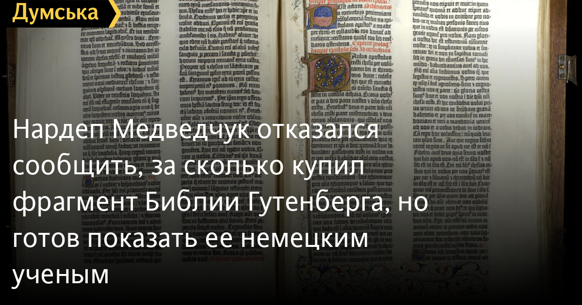 Нардеп Медведчук отказался сообщить, за сколько купил фрагмент Библии Гутенберга, но готов показать ее немецким ученымДепутат «Оппоплатформы» Виктор Медведчук не стал сообщать, за сколько приобрел фрагмент Библии Йоганеса Гутенберга. «Ни одним законом нельзя меня обязать об этом говорить,- ответил он на вопрос журналистов «Радио Свобода». — Это было очень давно. Где-то 10-8 лет назад. И я с удовольствием приобрел этот редкий и единственный экземпляр в Украине. Могу вам только сказать, что он приобретен в Украине у известного коллекционера». В то же время Медведчук заявил, что готов показать редкую книгу немецким ученым. Напомним, имущественная декларация народного депутата и лидера «ОПЗЖ» Виктора Медведчука стала международной сенсацией в научных кругах — политика призвали предоставить информацию о фрагменте первой печатной в истории человечества книги — Библии Йоганеса Гутенберга, который, оказывается, есть в его коллекции. Ученые отмечают, что из 180 книг сохранились только 49. Почти все Библии Гутенберга сегодня находятся в ведущих библиотеках мира, таких как Библиотека Конгресса в Вашингтоне, Национальная библиотека в Париже, лондонская British Library или Университетская библиотека Геттингена. Обычно первые печатные книги не найдешь на рынке антиквариата. СМЕРТЬ РОССИЙСКИМ ОККУПАНТАМ! Заметили ошибку? Выделяйте слова с ошибкой и нажимайте control-enter |