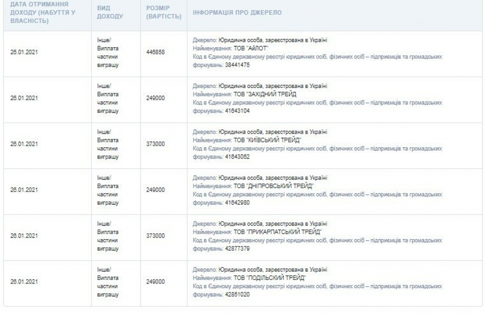 Согласно декларации, Павлюк 26 января 2021 года получил доход в сумме 1,94 млн гривен. Причем выиграл все в один день.