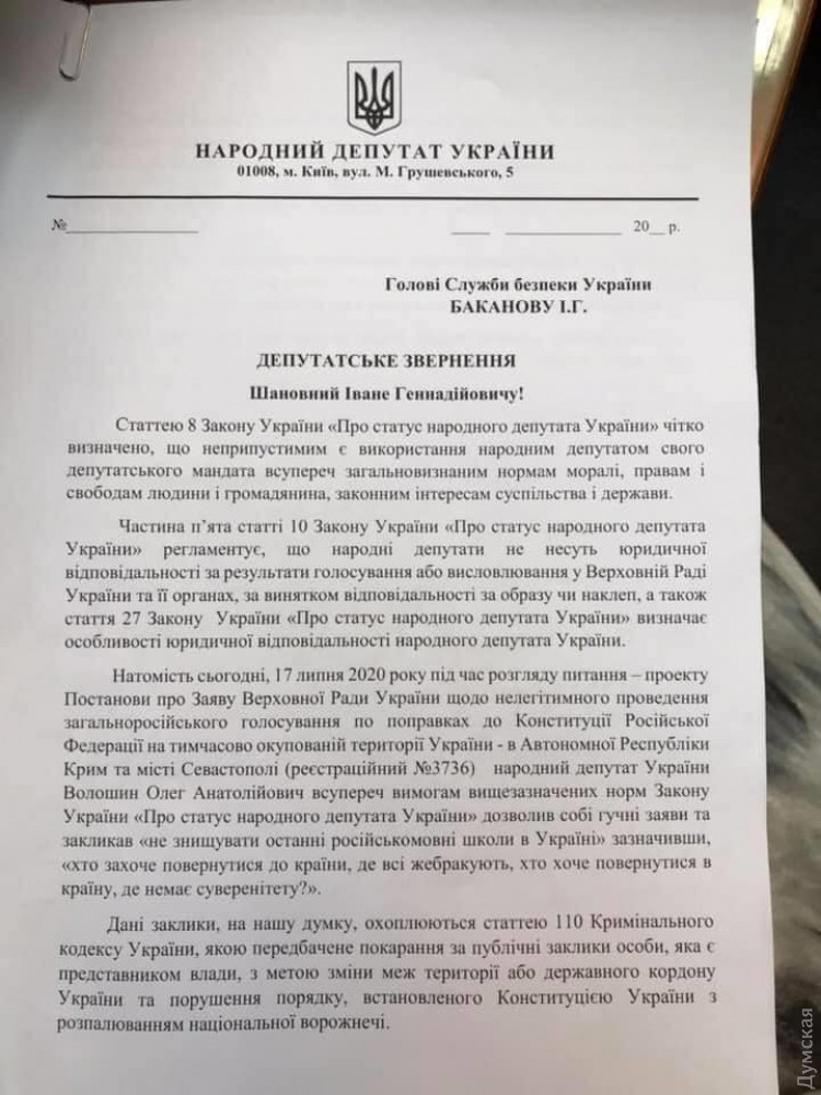 Нардепы потребовали от СБУ открыть производство против депутата ОПЗЖ за высказывание о суверенитете УкраиныНародные депутаты Украины от фракции «Европейская Солидарность», «Голос» и «Слуга народа» обратились к главе Службы безопасности Ивану Баканову с требованием открыть уголовное производство в отношении представителя ОПЗЖ Олега Волошина. Об этом сообщила нардеп от «Европейской Солидарности» Ирина Геращенко. Причиной обращения стало высказывание Волошина на заседании Верховной Рады о том, что у Украины нет суверенитета. Нардепы уверены, что подобные заявления подпадают под статью 110 УК Украины, которая предусматривает наказание за публичные призывы представителей власти с целью изменения границ территории или государственной границы Украины и нарушение порядка, установленного Конституцией Украины, с разжиганием национальной розни. «Как и обещали, обратились к руководству СБУ с требованием возбудить дело за преступление в ВР, когда депутат отрицал суверенитет Украины, а это - государственная измена», — подчеркнула Геращенко. Напомним, 21 июля из-за этого же высказывания активисты облили Волошина зеленкой возле здания Верховной Рады. СМЕРТЬ РОССИЙСКИМ ОККУПАНТАМ! Заметили ошибку? Выделяйте слова с ошибкой и нажимайте control-enter |