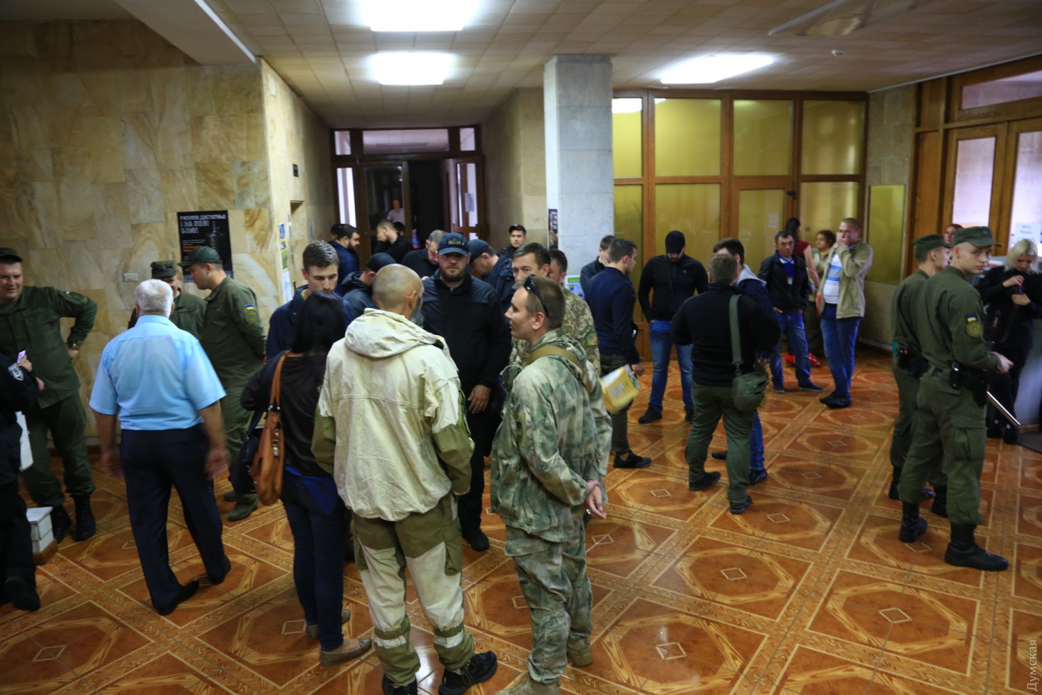 В холле административного здания находятся представители добровольческого батальона «Аратта». Зачем они там, бойцы говорить отказываются.