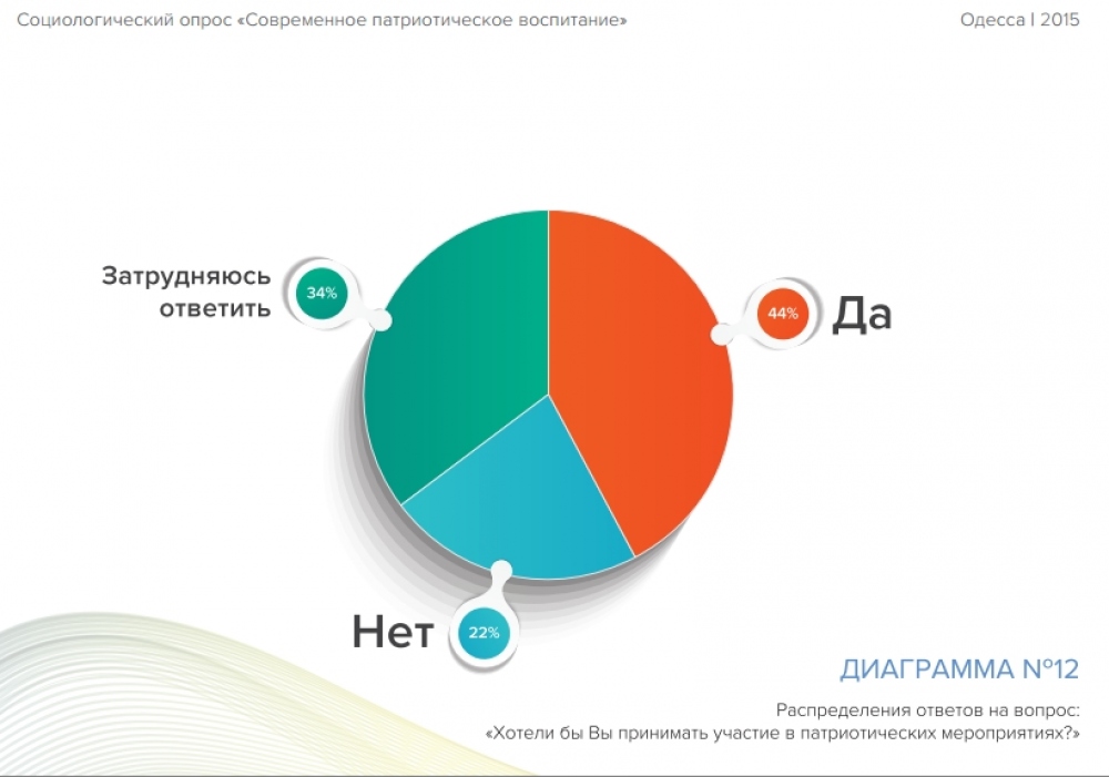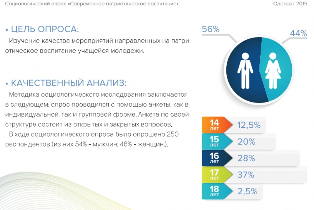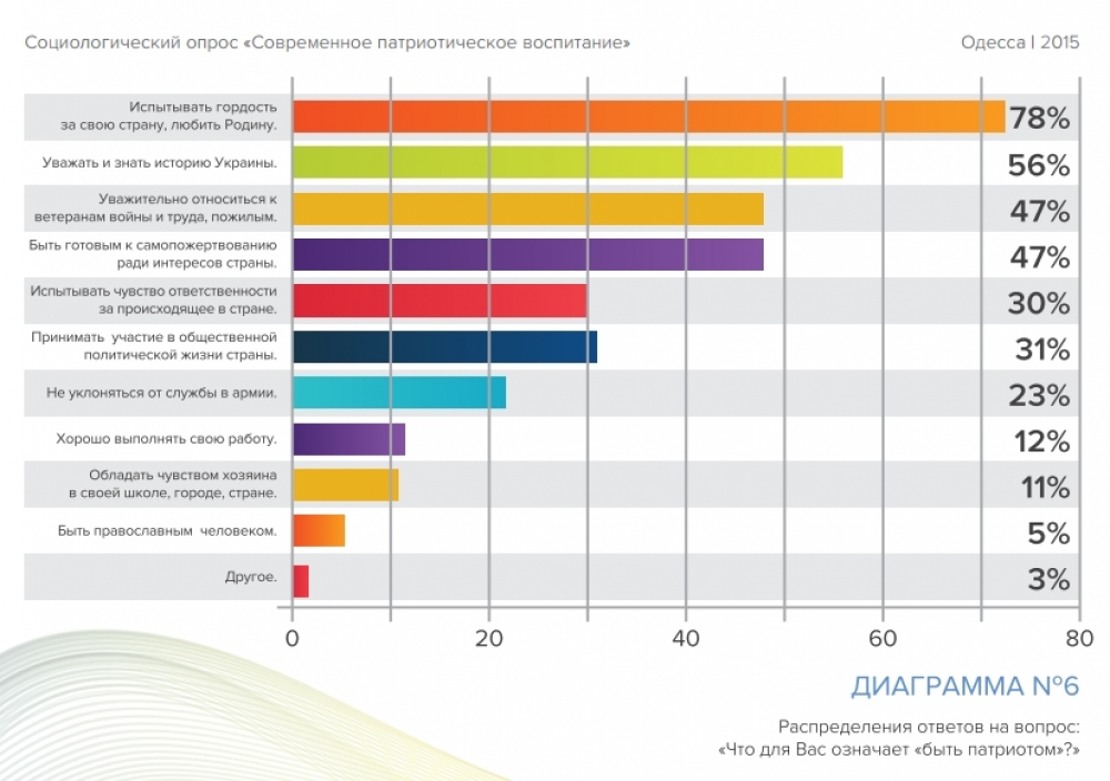 «Народный фронт молодежи»: одесские школьники стали более лояльно относиться к патриотическим организациям (политика)В Одессе презентовали Всеукраинскую молодежную общественную организацию «Народный фронт молодежи» и результаты комплексного опроса на тему патриотического воспитания. Как сообщил в ходе пресс-конференции глава регионального представительства организации Вениамин Унгурян, основная задача «Народного фронта» — подготовка молодого поколения к участию в общественной деятельности, формирование среди молодежи практических навыков для будущей управленческой (политической) деятельности. Кроме того, одним из основных направлений деятельности является военно-патриотическое воспитание молодежи. Член молодежного совета при Одесском городском голове, представитель молодежного общественного движения «Партнер» Александр Майнов рассказал об итогах опроса, проведенного среди учащихся 8-11 классов общеобразовательных учреждений Одессы на тему «Современное патриотическое воспитание». Примечательно, что такой же опрос проводился в 2012-2013 годах, что позволяет анализировать изменения. Так в этом году меньше школьников на вопрос, кем ощущаете себя, дали ответы «советским человеком» (всего 1%) и «европейцем» (7%). Первый факт общественник связывает с годами рождения респондентов, а второй – с неоправданными ожиданиями насчет вступления Украины в Евросоюз Союз. Далее следующие вопросы показали, что раньше школьники рассматривали ЕС как возможность работы, а теперь больше внимания обращают на европейские ценности. На вопрос, какие обстоятельства заставили бы вас покинуть Украину, в 2015 году ответ «война» выбрали 62% школьников. В опросах прошлых лет этот вариант тоже был, но набрал тогда только 27%. Слово «Родина» с Украиной сейчас связывают 41% учащихся, что на 20% больше, чем раньше. Кроме того, в этом году больше участников опроса считают, что быть патриотом, значит не уклоняться от службы в армии. «Среди социальных институтов, которые должны воспитывать патриотизм, по-прежнему лидирует семья. Но тут важно отметить, что молодежь стала более лояльно относиться к патриотическим организациям. Этот вариант выбрали на 12% больше респондентов, чем 2012-2013 годах», — говорилось на мероприятии. Среди патриотических мероприятий, которые проводятся в школах, стали более популярными военно-спортивные соревнования. В целом, желание принимать участие в патриотических мероприятиях выразили 44% респондентов, что на 20% больше чем раннее. В сентябре подобный опрос планируется провести среди студентов. Также участники пресс-конференции представили Программу современного патриотического воспитания, идея которой заключается в том, чтобы объединить усилия всех организаций и структур, который работают в этом направлении, составить единый список мероприятий (культурных, спортивных состязаний, патриотических квестов и т.д) и утвердить его на уровне Кабмина. «Мы работаем в этом направлении семь лет. И можем сказать, что такие мероприятия требуют большого ресурса, не столько даже материального, сколько физического. Поэтому мы предлагаем объединить усилия. Хотим, чтобы пилотный проект программы реализовывался в Одесском регионе», — отметили на пресс-конференции. «Кроме этих практических вещей, очень важно общение. Поэтому очень актуальным