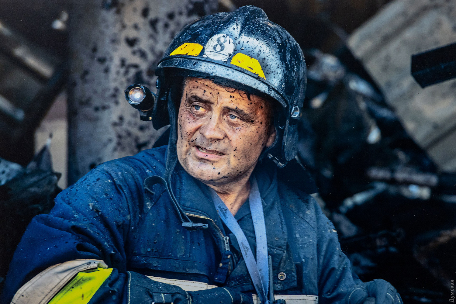 В этом помещении был пожар вследствие атаки. Спасатели до сих пор проливают.