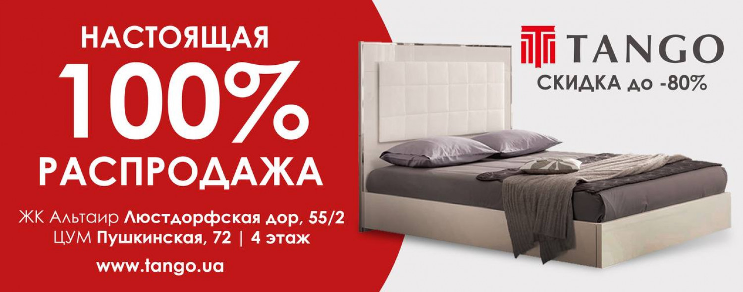 Настоящая 100% распродажа мебели — магазины «Танго» распродают всю экспозицию и складские запасы. Абсолютно на все спальни, гостиные, столовые и мягкую мебель от лучших итальянских дизайнеров предлагается реальная скидка до 80%.