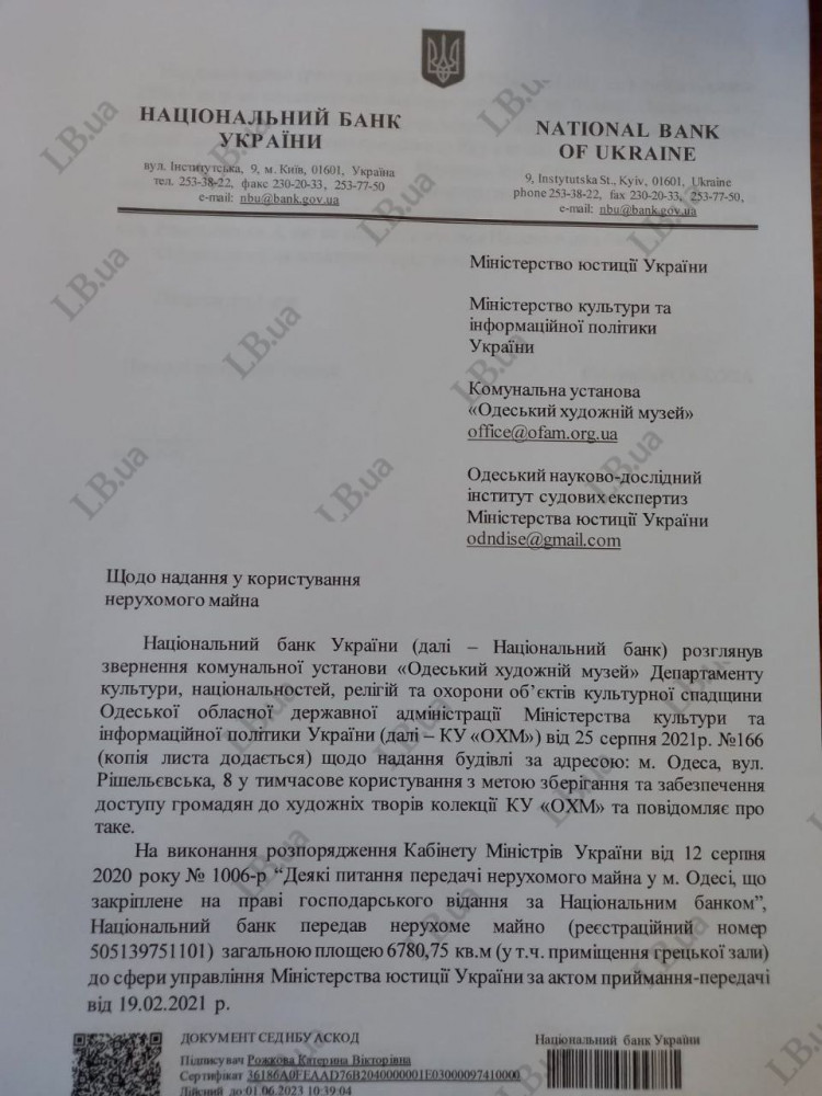 Нацбанк согласился передать Одесскому художественному музею часть здания на Ришельевской (документ)Национальный банк Украины не возражает против передачи Одесскому художественному музею части здания по адресу Ришельевская, 8 (угол Дерибасовской). Об этом идет речь в официальном письме НБУ, которое опубликовало издание «Левый берег». Нацбанк напомнил, что в прошлом году помещения на Ришельевской площадью 6,5 тыс. кв. м правительство передало в распоряжение Министерства юстиции. Еще 3,5 тыс. кв. м остаются на балансе Нацбанка и используются им. «Национальный банк не возражает против отработки коммунальным учреждением «Одесский художественный музей» совместно с Министерством юстиции вопроса о передаче в арендное пользование ОХМ части недвижимого имущества, которое не используется НБУ», — отмечается в письме. Напомним, нехватка площадей для хранения коллекций и размещения экспозиции — одна из важнейших проблем Одесского художественного музея. Недавно скончавшийся директор ОХМ Александр Ройтбурд вел активные переговоры с местными властями, добивая предоставления музею новых помещений. Дом №8 по Ришельевской был построен в 1909-1911 годах по проекту архитектора Самуила Гальперсона для Русско-Азиатского коммерческого банка. Ранее на него претендовал областной архив. СМЕРТЬ РОСІЙСЬКИМ ОКУПАНТАМ! Помітили помилку? Виділяйте слова з помилкою та натискайте control-enter