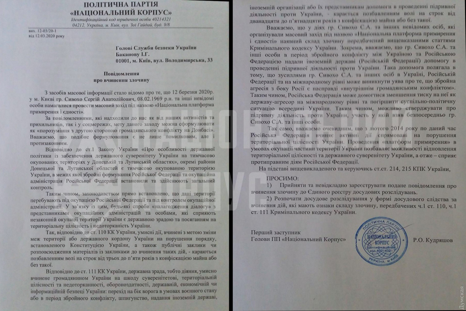 «Национальный корпус» направил в Службу безопасности Украины сообщение о совершении госизмены советником секретаря СНБО Сергеем Сивохо, который 12 марта инициировал в Киеве мероприятие под названием «Национальная платформа примирения и единства». Об этом сообщила пресс-служба организации. Правые уточнили, что целью указанного мероприятия было «взаимопонимание со второй стороной гражданского конфликта на Донбассе». «Считаем, что подобная формулировка является не только ошибочной, но и противозаконной», — говорится в заявлении. В «Нацкорпусе» напомнили, что, согласно закону, «отдельные районы Донецкой и Луганской областей являются временно оккупированными территориями Украины, в пределах которых вооруженные формирования РФ и оккупационная администрация РФ установили и осуществляют общий контроль». В документе отмечается, что в связи с этим любые попытки «наладить диалог» с представителями оккупационных администраций и лицами, которые содействуют незаконной оккупации украинской территории, являются госизменой и посягательством на территориальную целостность и неприкосновенность Украины в соответствии со ст.110, 111 УК Украины. «Считаем, что в действиях гр. Сивохо С.А. и других неизвестных лиц, которые организовали массовое мероприятие под названием «Национальная платформа примирения и единства», имеется состав преступления, предусмотренный вышеуказанными статьям Уголовного кодекса. В частности, считаем, что гр. Сивохо С.А. и другие лица в период вооруженного конфликта между Украиной и Российской Федерацией предоставили иностранному государству (Российской Федерации) помощь в проведении подрывной деятельности против Украины», — сказано в заявлении «Нацкорпуса». На основании вышеизложенного и руководствуясь ст. 214, 215 УПК Украины Нацкорпус попросил СБУ зарегистрировать сообщение о совершении преступления в ЕРДР и начать досудебное расследование за совершение действий, которые имеют признаки состава преступления, предусмотренных ч.1 ст. 110, ч.1 ст. 111 УК. Напомним, 12 марта в Киеве советник секретаря СНБО Сергей Сивохо попытался презентовать «Национальную платформу примирения и единства», но мероприятие сорвали представители «Нацкорпуса». Между сторонами возникла сначала словесная перепалка, а затем стычка, в ходе которой Сивохо упал, после чего покинул мероприятие. Позднее секретарь СНБО Алексей Данилов заявил, что Сивохо является лишь одним из 11 его внештатных советников и никто не давал ему официальных полномочий представлять позицию Совета. СМЕРТЬ РОССИЙСКИМ ОККУПАНТАМ! Заметили ошибку? Выделяйте слова с ошибкой и нажимайте control-enter |