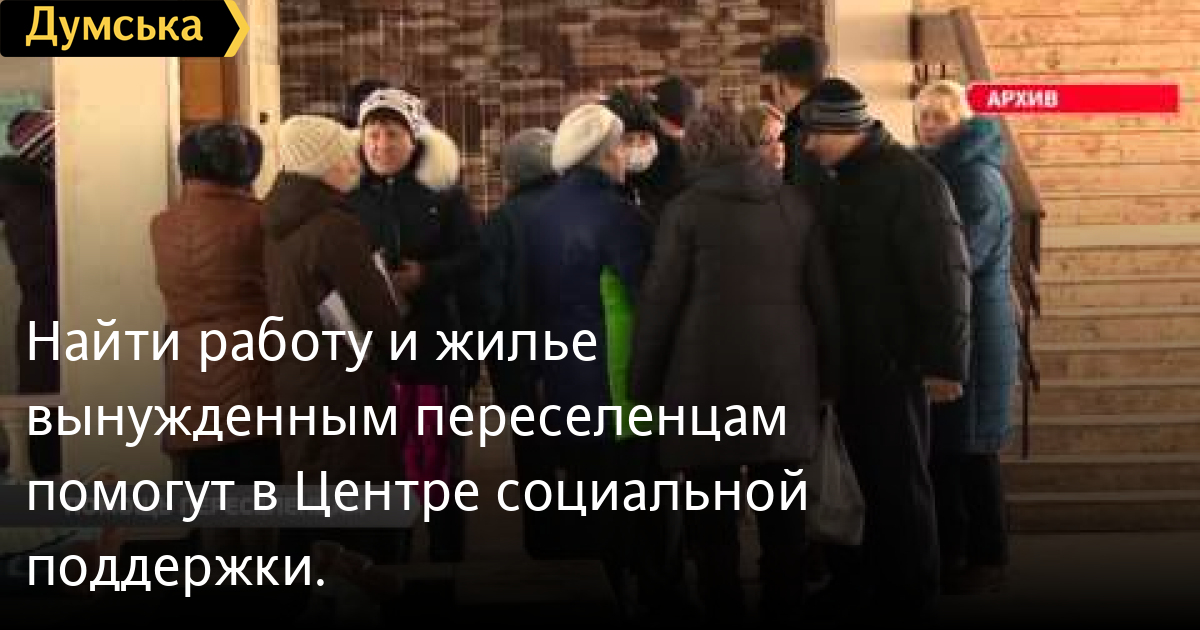 Найти работу и жилье вынужденным переселенцам помогут в Центре социальной поддержки.СМЕРТЬ РОССИЙСКИМ ОККУПАНТАМ! Заметили ошибку? Выделяйте слова с ошибкой и нажимайте control-enter Думская ТВ. Сюжеты: