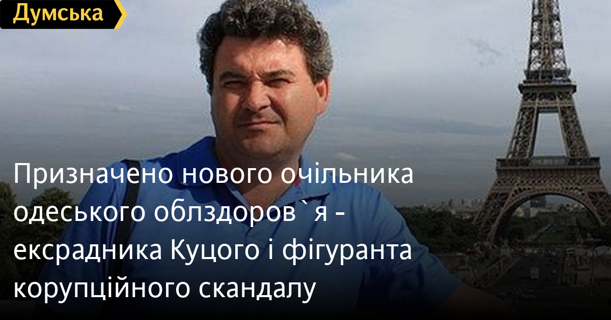 Призначено нового очільника одеського облздоров`я — ексрадника Куцого і фігуранта корупційного скандалуГолова Одеської обласної військової адміністрації Олег Кіпер підписав розпорядження про призначення директором обласного департаманта охорони здоров'я Олександра Курмішова. Новий чиновник заступить на посаду 15 серпня з офіційним окладом у розмірі 12 тисяч 800 гривень. Зазначимо, для Курмішова — це не перша посада в структурі обласної адміністрації. За часів губернаторства Максима Куцого він був його радником, а також претендував на крісло заступника директора департаменту з питань реформування. Раніше він очолював Київський обласний центр екстреної медичної допомоги та медицини катастроф, де відзначився закупівлею семи машин швидкої допомоги за 15 мільйонів гривень. СМЕРТЬ РОСІЙСЬКИМ ОКУПАНТАМ! Помітили помилку? Виділяйте слова з помилкою та натискайте control-enter
