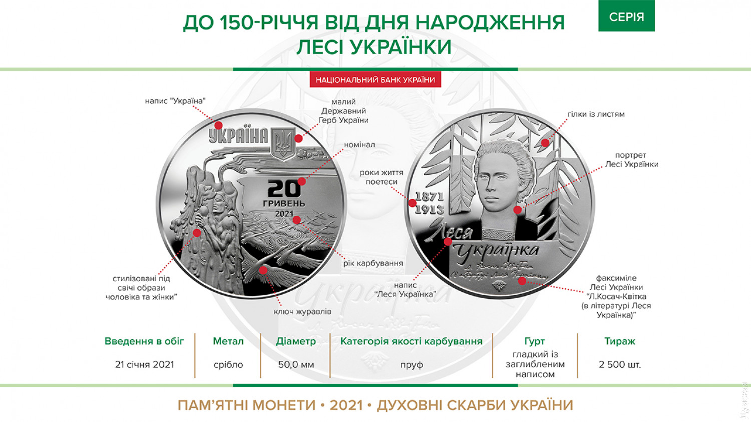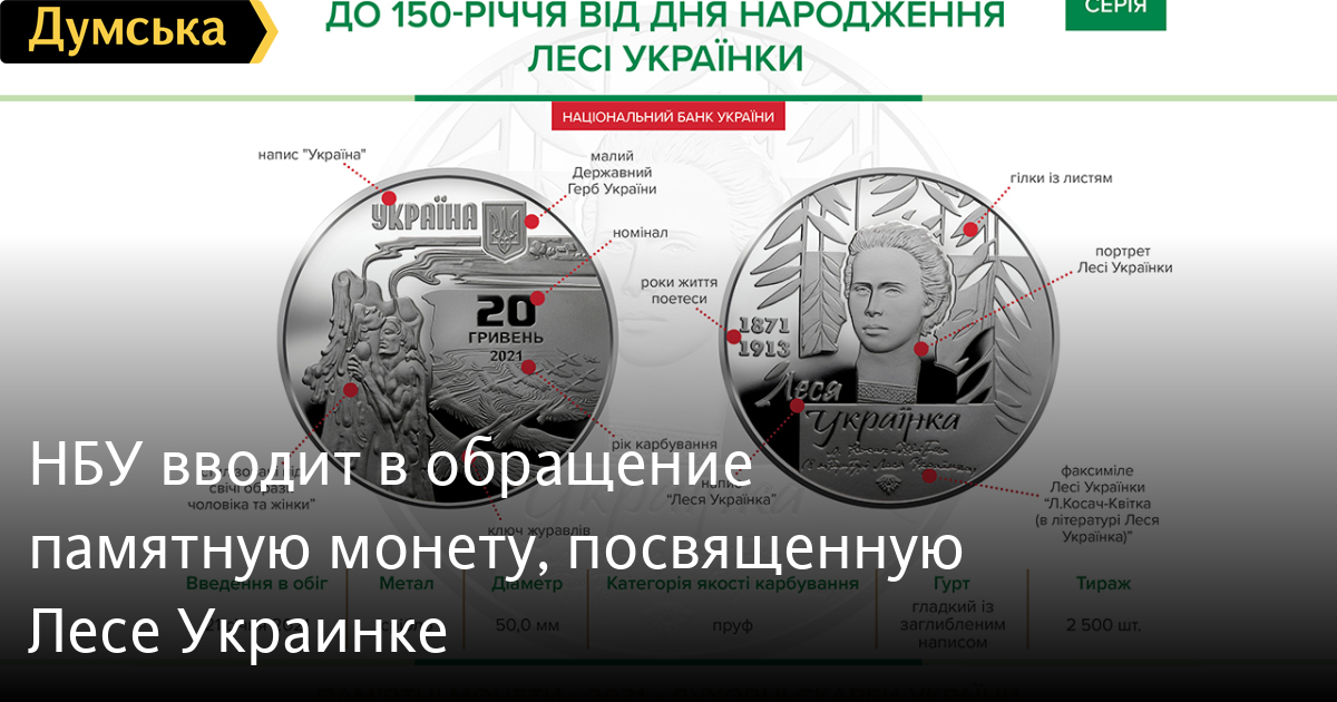 Национальный банк Украины вводит в обращение с 21 января текущего года памятную монету «К 150-летию со дня рождения Леси Украинки». Об этом сообщила пресс-служба НБУ. Монета будет сделана из серебра, номиналом 20 грн. Она будет посвящена украинской поэтессе, драматургу, переводчице, литературному критику и общественному деятелю — Лесе Украинке (Лариса Петровна Косач). «Леся Украинка — один из самых выдающихся украинских художников слова. Многогранный талант писательницы отобразился в самых разнообразных жанрах — лирике, эпосе, драме, прозе, публицистике. Ее творчество полно глубоких патриотических чувств к Украине», — сказано в сообщении НБУ. На аверсе монеты вверху размещена надпись УКРАИНА, справа от которой малый Государственный Герб Украины; и композиция, символизирующая яркий, эмоциональный, богатый мир поэзии Леси Украинки. Слева на зеркальном фоне — стилизованные под свечи образы мужчины и женщины; справа — ключ журавлей, над которым номинал и год чеканки монеты 20/ГРИВЕНЬ/2021. На реверсе монеты на фоне стилизованных веток с листьями изображен портрет Леси Украинки; слева — годы жизни 1871/1913; надписи: Леся Украинка (под портретом), Л. Косач-Квитка. СМЕРТЬ РОССИЙСКИМ ОККУПАНТАМ! Заметили ошибку? Выделяйте слова с ошибкой и нажимайте control-enter |