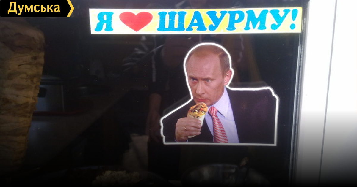 Изображение главы соседнего государства, которому в «Фотошопе» грубо пририсовали ближневосточное кушанье, вызывает интерес у прохожих, однако очередь за «путинской» шаурмой не выстраивается. Очевидно, не такая она и вкусная, как утверждают владельцы заведения.