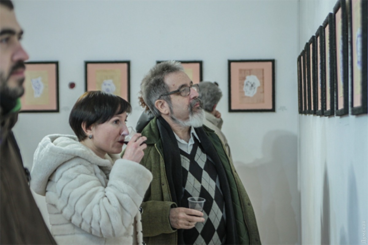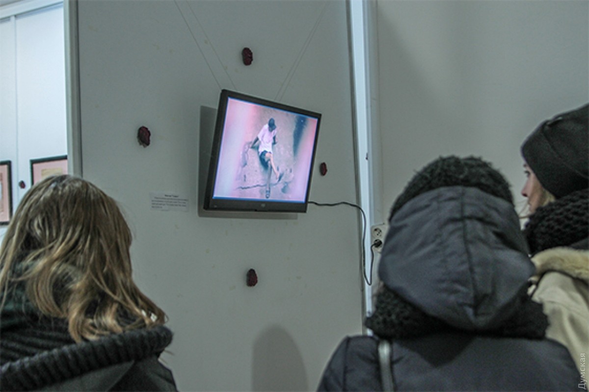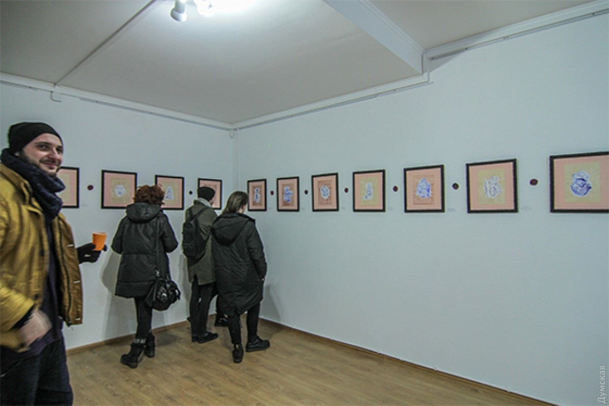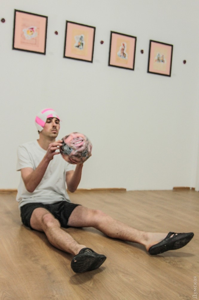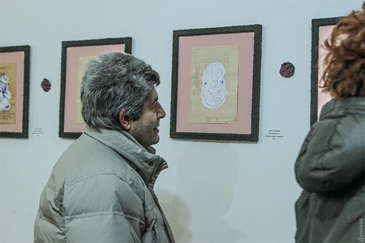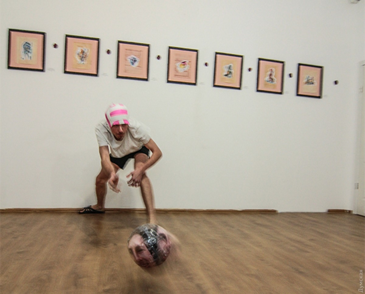 А уже во время показанного на вернисаже перформанса гость из Херсона перевоплотился в того самого гражданина с тапком, а потом устроил небольшой футбольный матч, пиная мяч с наклеенным на него собственным фотопортретом… Действо сие называлось «Самовольное бичевание». «На протяжении жизни нам выносят мозги родители и родственники, учителя и преподаватели, начальники и депутаты. А как же приятно прийти домой, от всех людей подальше, и самому себе вынести башню. Человек нуждается в самоунижении», — комментирует херсонский художник. И в очередной раз пинает собственное лицо на мяче. Зрители не отстают и подыгрывают! Надо сказать, рисует Валерий просто мастерски, стремясь подвергать натуру деформации. Часто делает зарисовки в маршрутке и метро. «Однажды я увидел в киевском метро плачущую девушку, — говорит Валерий. – Я тут же нарисовал ее и подарил ей рисунок. Девушка улыбнулась, а я получил новый импульс к занятиям творчеством – они нужны людям!». Повесив рисунки на стены выставочного зала, автор словно пригвоздил ряд человеческих пороков и навязчивых состояний. «За пределами головного мозга жило то, чему нельзя дать обозначение, — пишется в авторской аннотации к выставке. — У нее не было дома и близких, у него не было имени и возраста. Упал человек на мокрую землю и заплакал прекрасной песней о том, как невозможно понять всю вселенную. Соленые слезы лились по всему телу. В этот момент Бог решил развесить человеческие тела так же, как люди развешивают соленую рыбу. Будет время подумать, вися вверх ногами, — вся информация перетекает в чердачный череп. Они напишут потом книги и отснимут фильмы, споют песни и нарисуют картины про то, как тяжело залатать дырку в голове. Ощущение своей безграничности начинает преследовать каждую душу на этой земле». «Сейчас Одесса довольно мертвоватая, зимняя, напряженная, — заявил на вернисаже куратор «Артерии», одесский художник Роман Громов. – Но тем не менее мы продолжаем делать выставки художников. Способных своим искусством на что-то повлиять, кому-то помочь, нечто важное донести… Сегодня много «мертвого искусства, в которое художник не вложил эмоции, а зритель, соответственно, не получает их. Валерий – это родниковый ключ, бегущий ручей, он делает хороший качественный арт. Такого искусства боятся, на него не знают, как реагировать, возникает отторжение. Не знаю, как вы, я чувствую в этом универсальном, мультимедийном художнике большую силу. Из таких художников складывается настоящее искусство». Интересно, что сам Роман сейчас готовится к участию в большой международной выставке в Нью-Йорке, в рамках одной из самых крупных в мире арт-ярмарок The Armory Show, которая будет проходить с 4 по 16 марта. Громову посчастливилось попасть в тридцатку художников со всего мира, чтобы представлять Одессу и Украину в проекте, посвященном Дональду Трампу и носящем название Trumpomania. Выставка создает диалог о том, как видят президента Америки в каждой отдельной стране, о том, как мировоззрение и отдаленность от США влияет на мнение о конкретном субъекте. Также каждый художник проиллюстрирует, какое будущее может ждать его нацию, государство и весь мир в связи с историческим выигрышем на выборах американского миллиардера. Кураторы отмечают, что выставка не является агитацией ни за, ни против Трампа. «Саму работу по