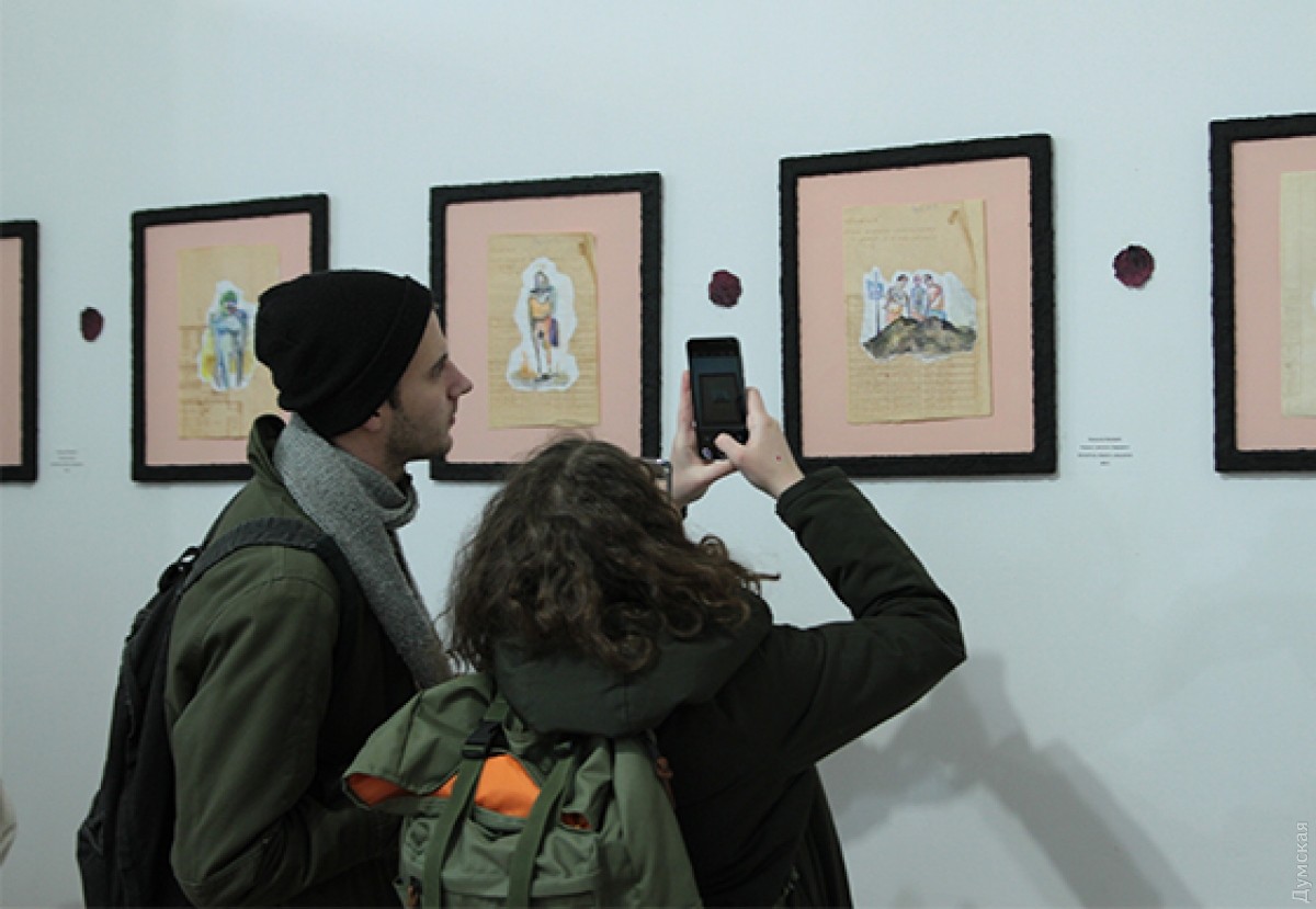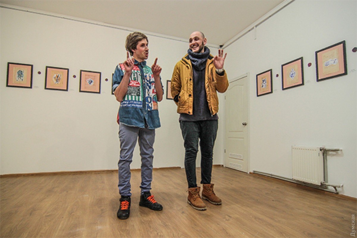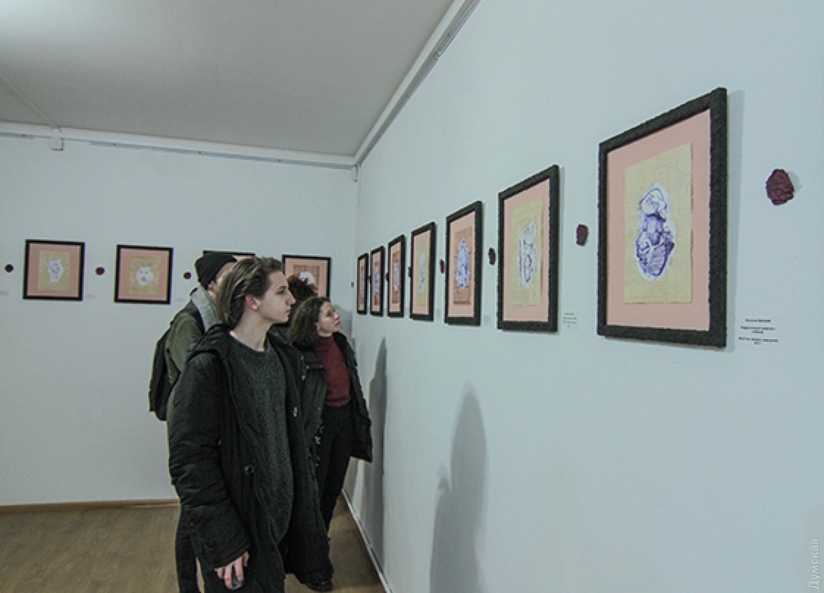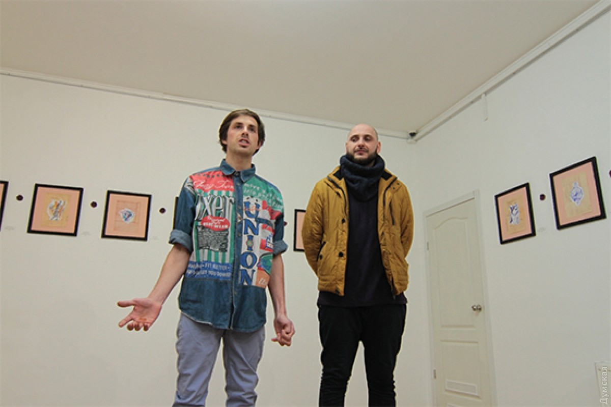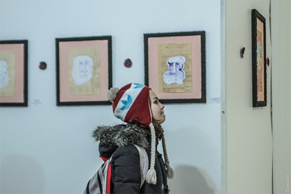 А уже во время показанного на вернисаже перформанса гость из Херсона перевоплотился в того самого гражданина с тапком, а потом устроил небольшой футбольный матч, пиная мяч с наклеенным на него собственным фотопортретом… Действо сие называлось «Самовольное бичевание». «На протяжении жизни нам выносят мозги родители и родственники, учителя и преподаватели, начальники и депутаты. А как же приятно прийти домой, от всех людей подальше, и самому себе вынести башню. Человек нуждается в самоунижении», — комментирует херсонский художник. И в очередной раз пинает собственное лицо на мяче. Зрители не отстают и подыгрывают! Надо сказать, рисует Валерий просто мастерски, стремясь подвергать натуру деформации. Часто делает зарисовки в маршрутке и метро. «Однажды я увидел в киевском метро плачущую девушку, — говорит Валерий. – Я тут же нарисовал ее и подарил ей рисунок. Девушка улыбнулась, а я получил новый импульс к занятиям творчеством – они нужны людям!». Повесив рисунки на стены выставочного зала, автор словно пригвоздил ряд человеческих пороков и навязчивых состояний. «За пределами головного мозга жило то, чему нельзя дать обозначение, — пишется в авторской аннотации к выставке. — У нее не было дома и близких, у него не было имени и возраста. Упал человек на мокрую землю и заплакал прекрасной песней о том, как невозможно понять всю вселенную. Соленые слезы лились по всему телу. В этот момент Бог решил развесить человеческие тела так же, как люди развешивают соленую рыбу. Будет время подумать, вися вверх ногами, — вся информация перетекает в чердачный череп. Они напишут потом книги и отснимут фильмы, споют песни и нарисуют картины про то, как тяжело залатать дырку в голове. Ощущение своей безграничности начинает преследовать каждую душу на этой земле». «Сейчас Одесса довольно мертвоватая, зимняя, напряженная, — заявил на вернисаже куратор «Артерии», одесский художник Роман Громов. – Но тем не менее мы продолжаем делать выставки художников. Способных своим искусством на что-то повлиять, кому-то помочь, нечто важное донести… Сегодня много «мертвого искусства, в которое художник не вложил эмоции, а зритель, соответственно, не получает их. Валерий – это родниковый ключ, бегущий ручей, он делает хороший качественный арт. Такого искусства боятся, на него не знают, как реагировать, возникает отторжение. Не знаю, как вы, я чувствую в этом универсальном, мультимедийном художнике большую силу. Из таких художников складывается настоящее искусство». Интересно, что сам Роман сейчас готовится к участию в большой международной выставке в Нью-Йорке, в рамках одной из самых крупных в мире арт-ярмарок The Armory Show, которая будет проходить с 4 по 16 марта. Громову посчастливилось попасть в тридцатку художников со всего мира, чтобы представлять Одессу и Украину в проекте, посвященном Дональду Трампу и носящем название Trumpomania. Выставка создает диалог о том, как видят президента Америки в каждой отдельной стране, о том, как мировоззрение и отдаленность от США влияет на мнение о конкретном субъекте. Также каждый художник проиллюстрирует, какое будущее может ждать его нацию, государство и весь мир в связи с историческим выигрышем на выборах американского миллиардера. Кураторы отмечают, что выставка не является агитацией ни за, ни против Трампа. «Саму работу по