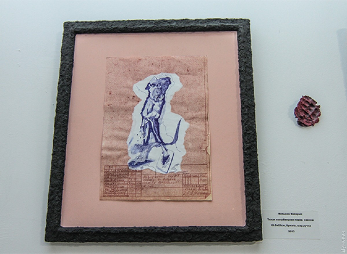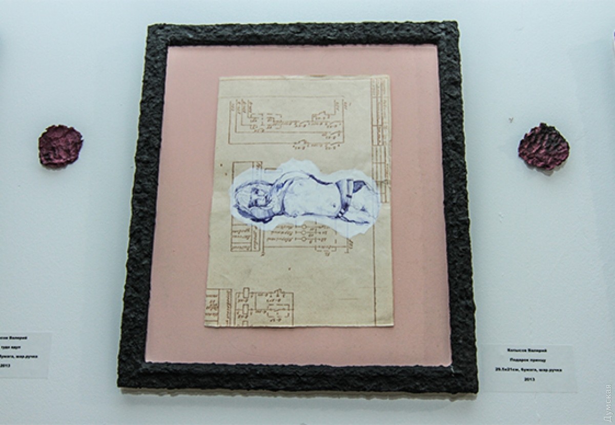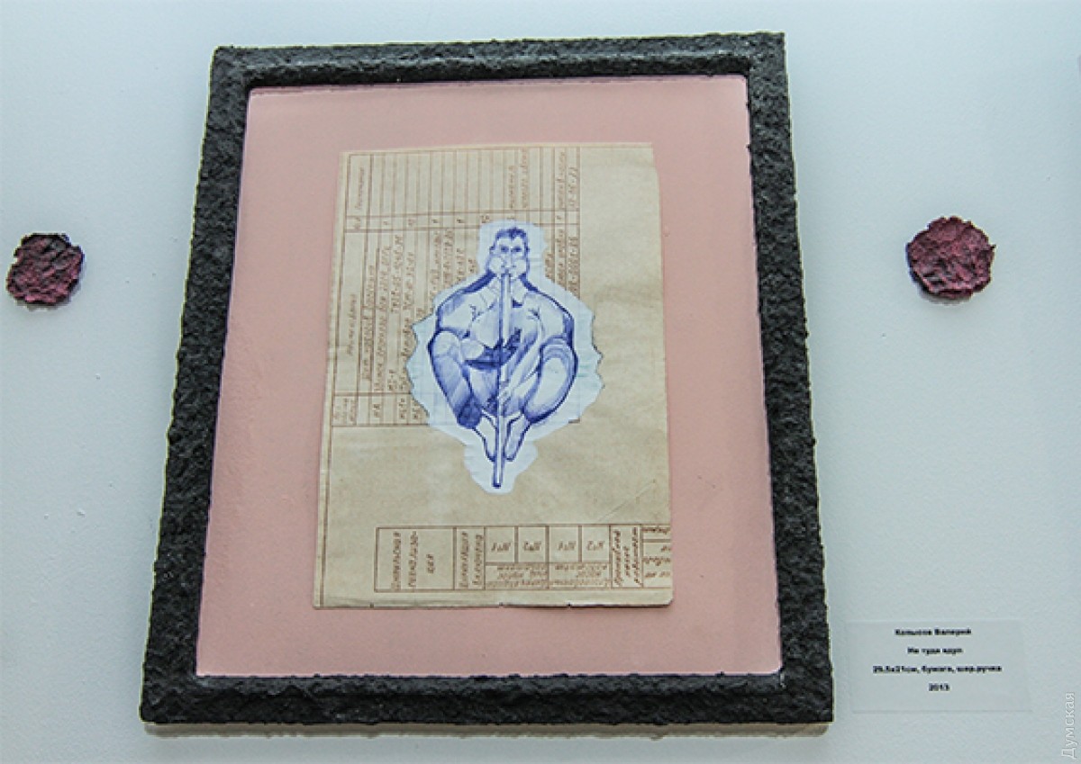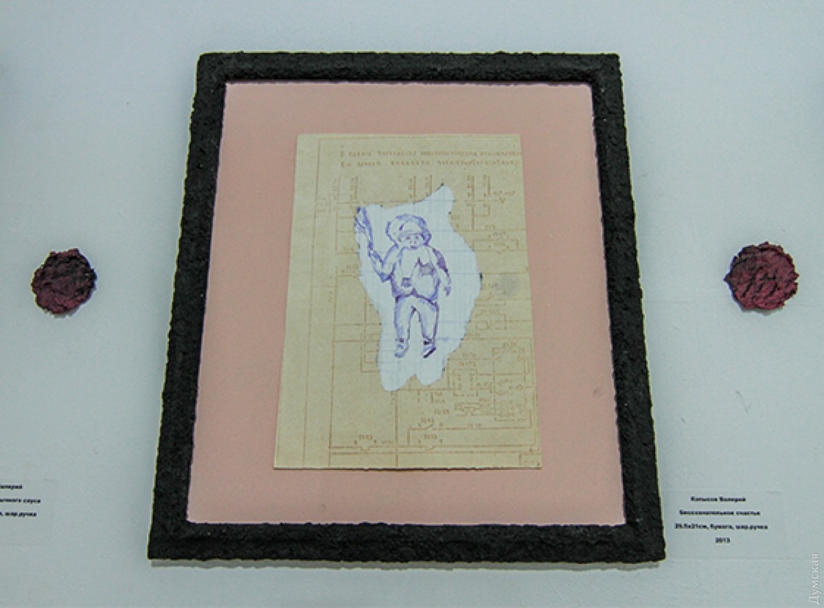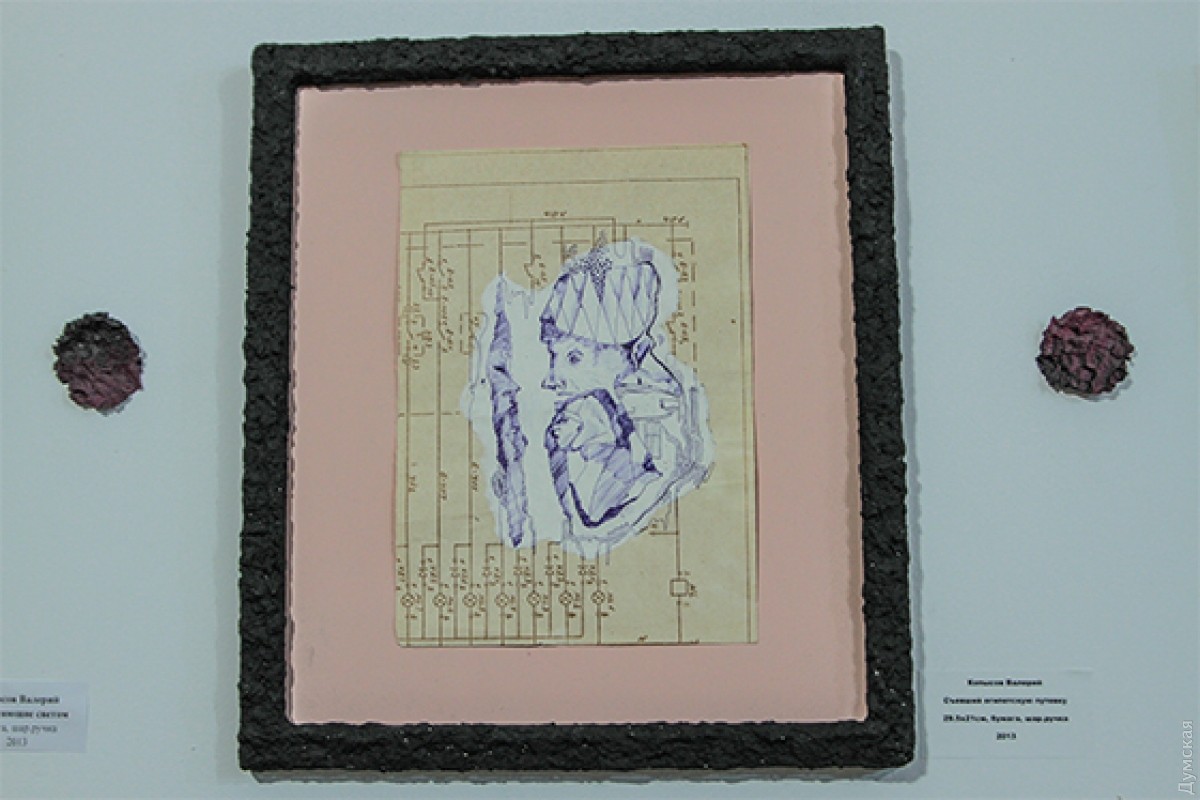 До 24 февраля в концепт-лаборатории «Артерия» (выставочный зал Музея современного искусства Одессы, Белинского, 5) можно увидеть первый в этом году проект молодого художника из Херсона Валерия Копысова под названием «Дырка в голове». На самом деле, там никто никому голову не дырявит, конечно. Вниманию зрителей представлена серия из пятидесяти листов графики, наклеенных на паспарту из копий чертежей, сделанных явно в каком-нибудь советском конструкторском бюро (как выяснилось, чертежи делал когда-то отец автора, вот и совместил Валерий продукцию двух членов одной семьи). Из папье-маше сделаны рамки (клей художник варит сам), а также кружочки, олицетворяющие, по его словам, некую черную дыру, вход и выход в пространство каждого рисунка. Названия работ весьма ироничны, а порой и эротичны: «Не туда вдул», «Тихая колыбельная перед сексом», «Групповое влечение». Впрочем, есть и ностальгическое «Бессознательное счастье» с фигурой ребенка. Кроме рисунков, сделанных шариковой ручкой, Валерий представил видео с медитирующим на собственный тапок гражданина, инсталляцию в виде запекающихся лиц-индивидуальностей на решетке, под которой «тлеют» угли информационного пространства.