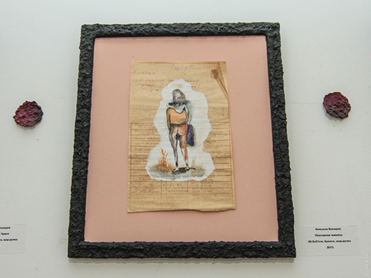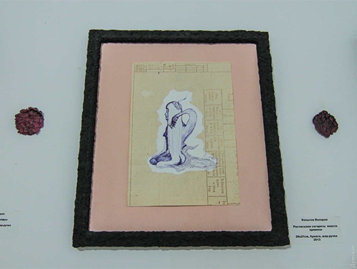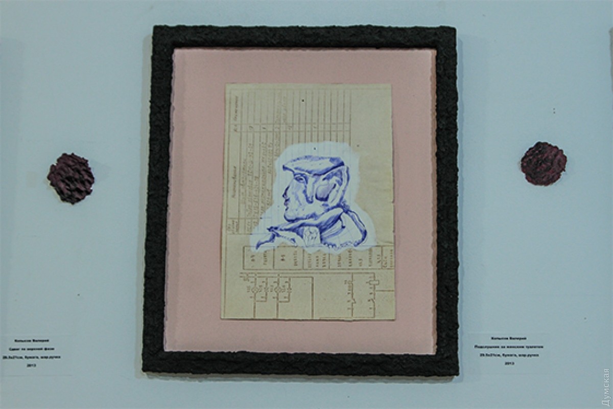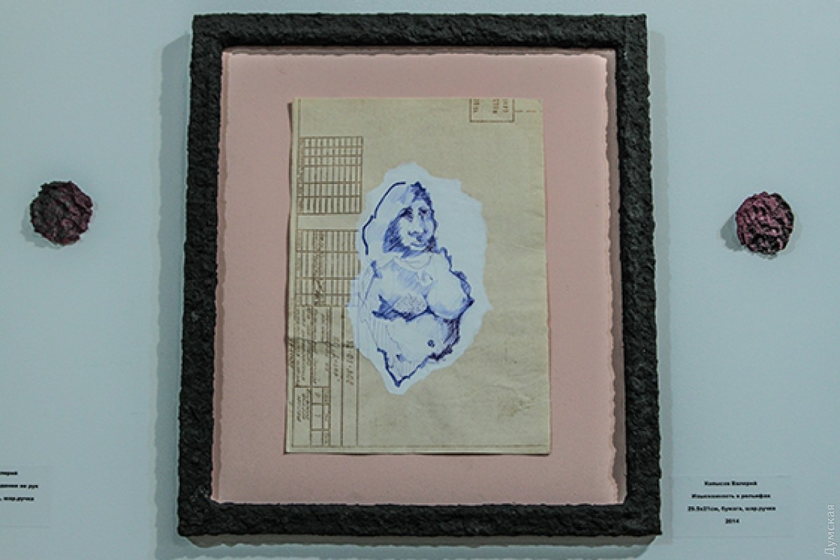 До 24 февраля в концепт-лаборатории «Артерия» (выставочный зал Музея современного искусства Одессы, Белинского, 5) можно увидеть первый в этом году проект молодого художника из Херсона Валерия Копысова под названием «Дырка в голове». На самом деле, там никто никому голову не дырявит, конечно. Вниманию зрителей представлена серия из пятидесяти листов графики, наклеенных на паспарту из копий чертежей, сделанных явно в каком-нибудь советском конструкторском бюро (как выяснилось, чертежи делал когда-то отец автора, вот и совместил Валерий продукцию двух членов одной семьи). Из папье-маше сделаны рамки (клей художник варит сам), а также кружочки, олицетворяющие, по его словам, некую черную дыру, вход и выход в пространство каждого рисунка. Названия работ весьма ироничны, а порой и эротичны: «Не туда вдул», «Тихая колыбельная перед сексом», «Групповое влечение». Впрочем, есть и ностальгическое «Бессознательное счастье» с фигурой ребенка. Кроме рисунков, сделанных шариковой ручкой, Валерий представил видео с медитирующим на собственный тапок гражданина, инсталляцию в виде запекающихся лиц-индивидуальностей на решетке, под которой «тлеют» угли информационного пространства.