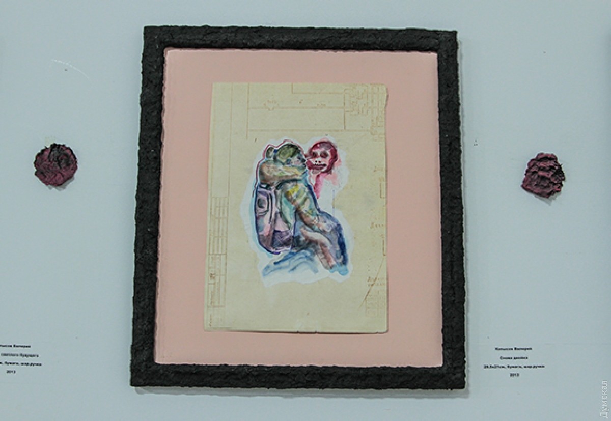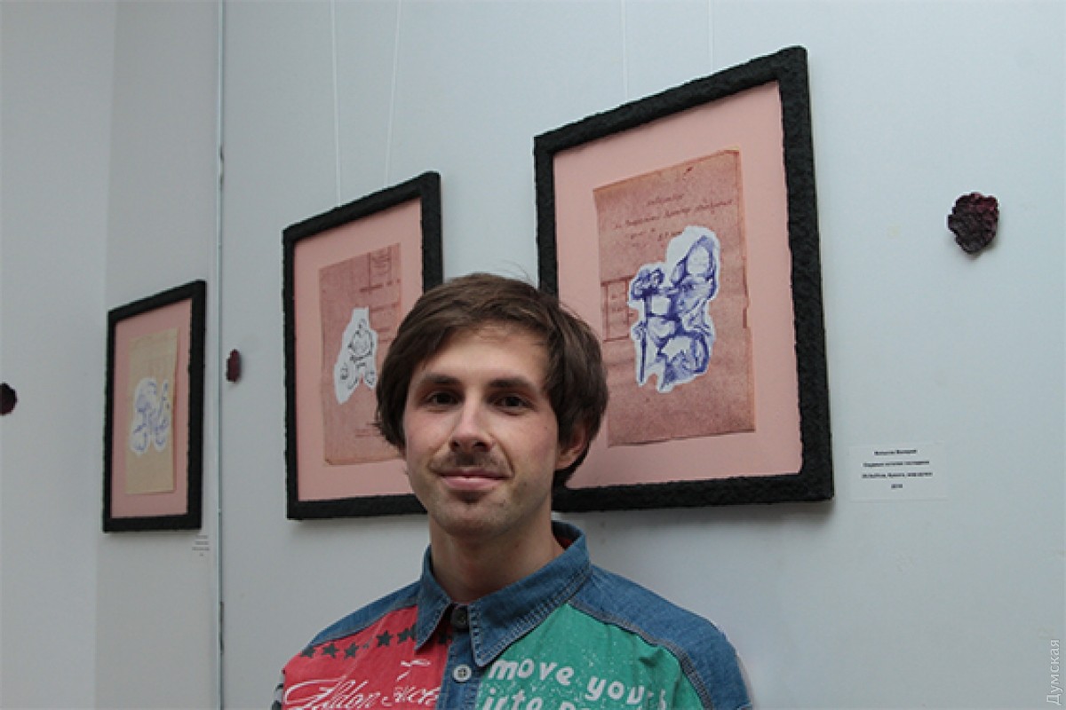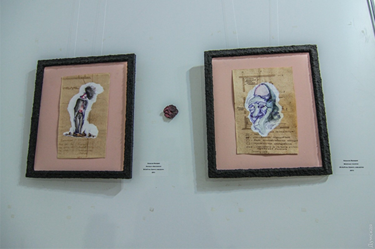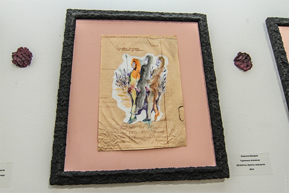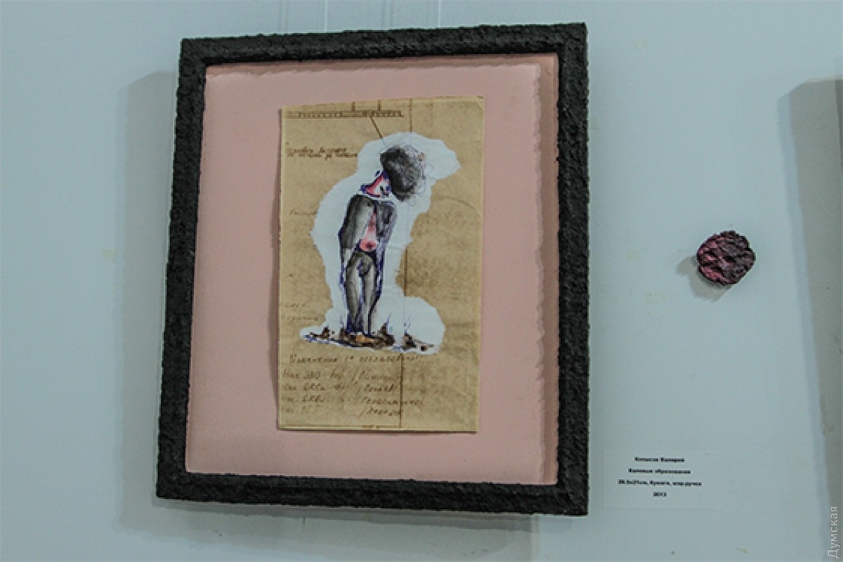 До 24 февраля в концепт-лаборатории «Артерия» (выставочный зал Музея современного искусства Одессы, Белинского, 5) можно увидеть первый в этом году проект молодого художника из Херсона Валерия Копысова под названием «Дырка в голове». На самом деле, там никто никому голову не дырявит, конечно. Вниманию зрителей представлена серия из пятидесяти листов графики, наклеенных на паспарту из копий чертежей, сделанных явно в каком-нибудь советском конструкторском бюро (как выяснилось, чертежи делал когда-то отец автора, вот и совместил Валерий продукцию двух членов одной семьи). Из папье-маше сделаны рамки (клей художник варит сам), а также кружочки, олицетворяющие, по его словам, некую черную дыру, вход и выход в пространство каждого рисунка. Названия работ весьма ироничны, а порой и эротичны: «Не туда вдул», «Тихая колыбельная перед сексом», «Групповое влечение». Впрочем, есть и ностальгическое «Бессознательное счастье» с фигурой ребенка. Кроме рисунков, сделанных шариковой ручкой, Валерий представил видео с медитирующим на собственный тапок гражданина, инсталляцию в виде запекающихся лиц-индивидуальностей на решетке, под которой «тлеют» угли информационного пространства.