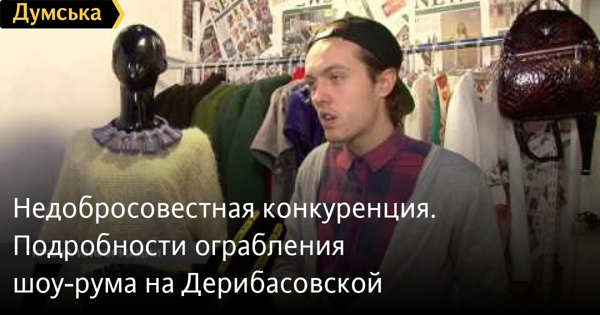 Недобросовестная конкуренция. Подробности ограбления шоу-рума на ДерибасовскойКонкуренция в одесском мире моды. С владельцами шоу-рума на Дерибасовской, ограбленному накануне, вышел на связь некий мужчина. Он заявил: украденные вещи у него, и за определенную сумму он готов их вернуть. Напомню, в ночь на 23-е февраля неизвестные проникли в бутик и скрылись с носителями корпоративной информации, оставив без внимания другие ценности СМЕРТЬ РОССИЙСКИМ ОККУПАНТАМ! Заметили ошибку? Выделяйте слова с ошибкой и нажимайте control-enter Думская ТВ. Сюжеты: