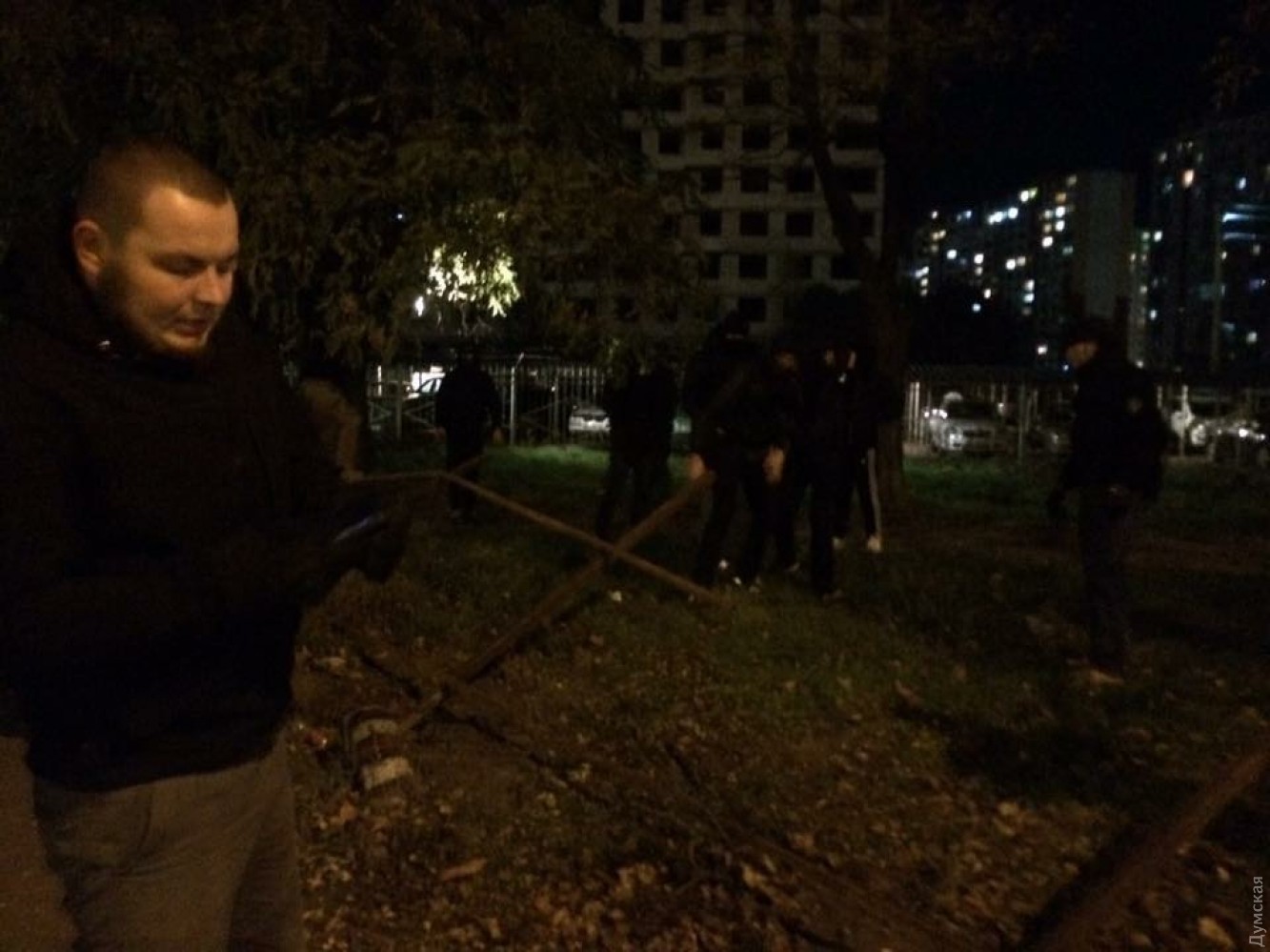 «Сегодня вечером, гуляя улицей Небесной сотни, стал свидетелем того, как несколько десятков неизвестных националистов немножко очистили наш город от очередной застройки, которую собирались начать на месте уличной зеленой зоны, которая служит своего рода живым щитом от дорожной пыли и выхлопных газов для жителей соседних домов», — рассказал он.