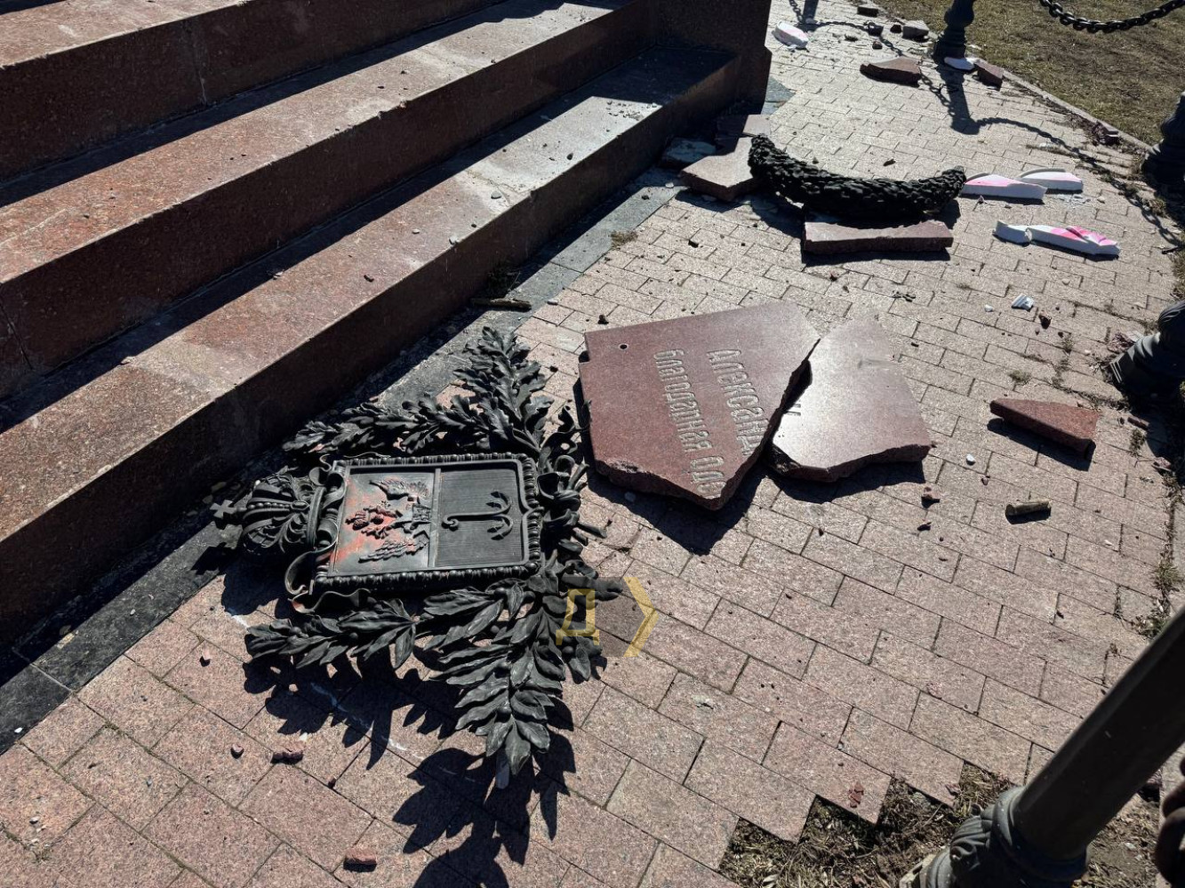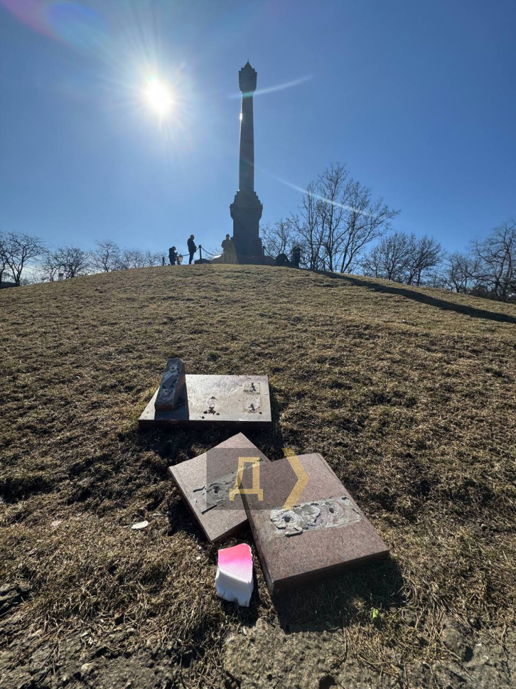 Александровская колонна в парке Шевченко пострадала от рук неизвестных вандалов — с монумента отбили памятную табличку и императорский герб.