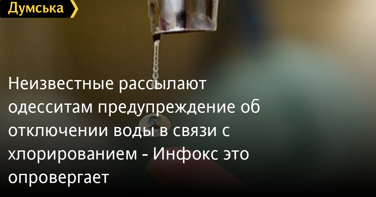Неизвестные рассылают одесситам предупреждение об отключении воды в связи с хлорированием — «Инфокс» это опровергаетВ «Инфоксводоканале» сообщают, что жителям Одессы через Viber и социальные сети распространяется сообщение от неизвестного источника с предупреждением от имени предприятия о плановых работах по промывке сетей и хлорированию воды, вследствие чего якобы в городе не будет воды с 21 по 23 октября. «В связи с этим, филиал «Инфоксводоканал» официально заявляет, что указанное сообщение содержит недостоверную информацию и носит провокационный характер в адрес предприятия. «Инфоксводоканал» не планирует проведение указанных работ и, как следствие, отключение всего города. На сегодняшний день водопроводная вода, поставляемая потребителям с ВОС «Днестр», отвечает действующим санитарным нормам и требованиям СанПин 2.2.4-171-10 к питьевой воде и безопасна к употреблению, что подтверждается последними результатами анализов. Сотрудники водоканала обращаются с просьбой не вестись на лживые и противоправные провокации и не создавать панику, запасаясь водой. Поскольку массовый забор воды из системы может привести к снижению давления в водопроводной сети»,- говорится в сообщении предприятия. Филиал «Инфоксводоканал» уже подготовил обращения во все правоохранительные органы по данному факту с целью поиска и привлечения к ответственности лиц, распространяющих заведомо ложную информацию. СМЕРТЬ РОССИЙСКИМ ОККУПАНТАМ! Заметили ошибку? Выделяйте слова с ошибкой и нажимайте control-enter |