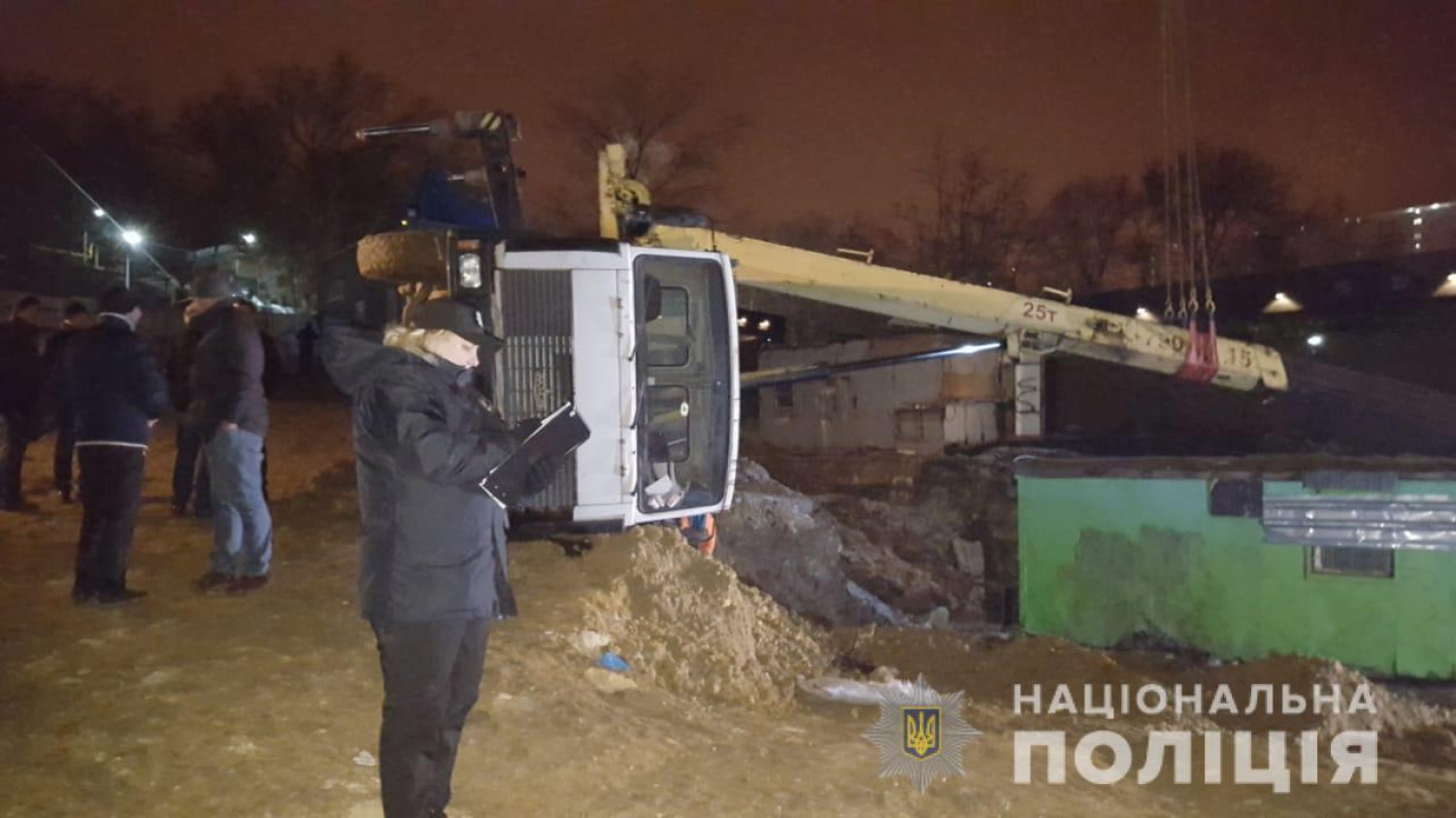 1. Автокран во время подъёма груза на вытянутой стреле рухнул в котлован около 15.00. Опрокидывание техники происходило достаточно медленно на протяжении минимум 10 сек. Двое разнорабочих находились в котловане под стрелой работающего автокрана(вероятно выполняли такелажные работы).Одному человеку от падающей стрелы удалось отклонится. Второй, (уроженец с.Евгеновка Тарутинського р-на) убегал по узкому коридору захламленного строительным мусором котлована и упал зацепившись ногой за торчащую арматуру. Стрела при падении самым краем, ударила человека по спине в на уровне лопаток.