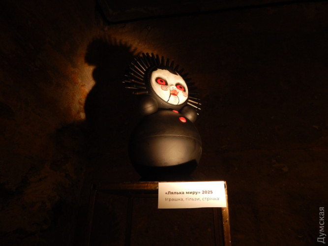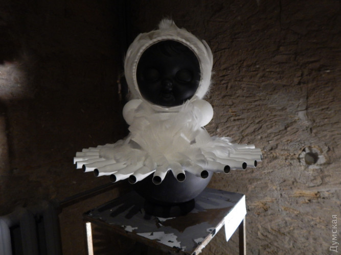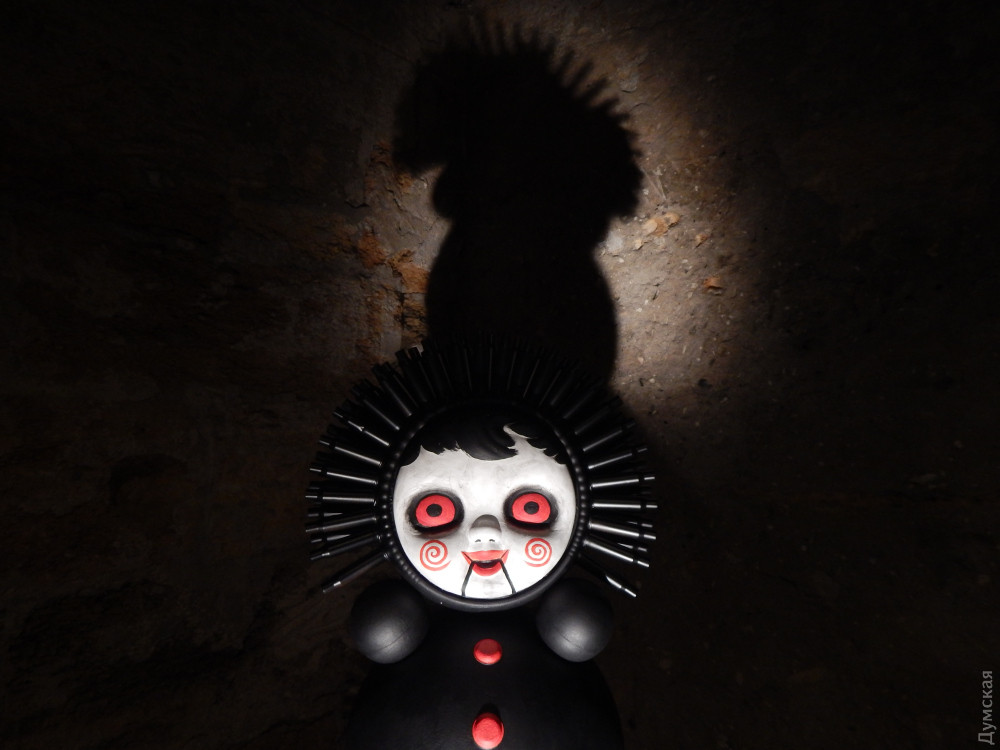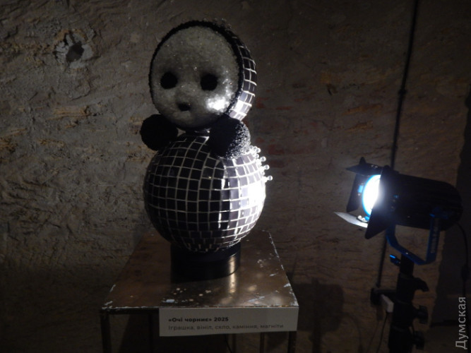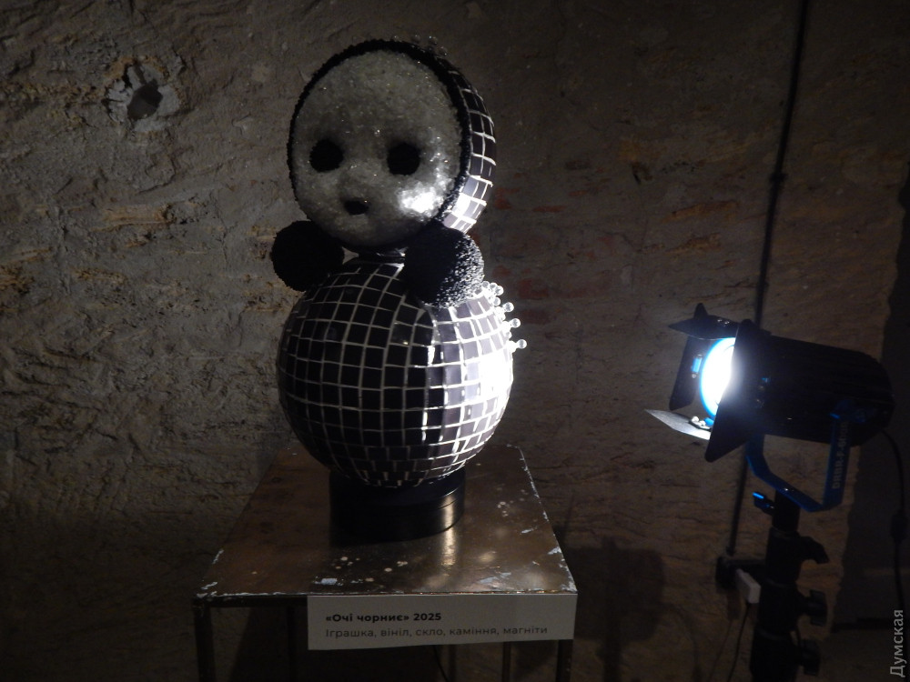 Беззвучно крутиться інша, величезна неваляшка з чорними плямами очей. Вона примхливо прикрашена, як дискотечна куля: на горбистих стінах підземелля — зайчики і плями від неї. Придивишся — це не блискітки, а скло.