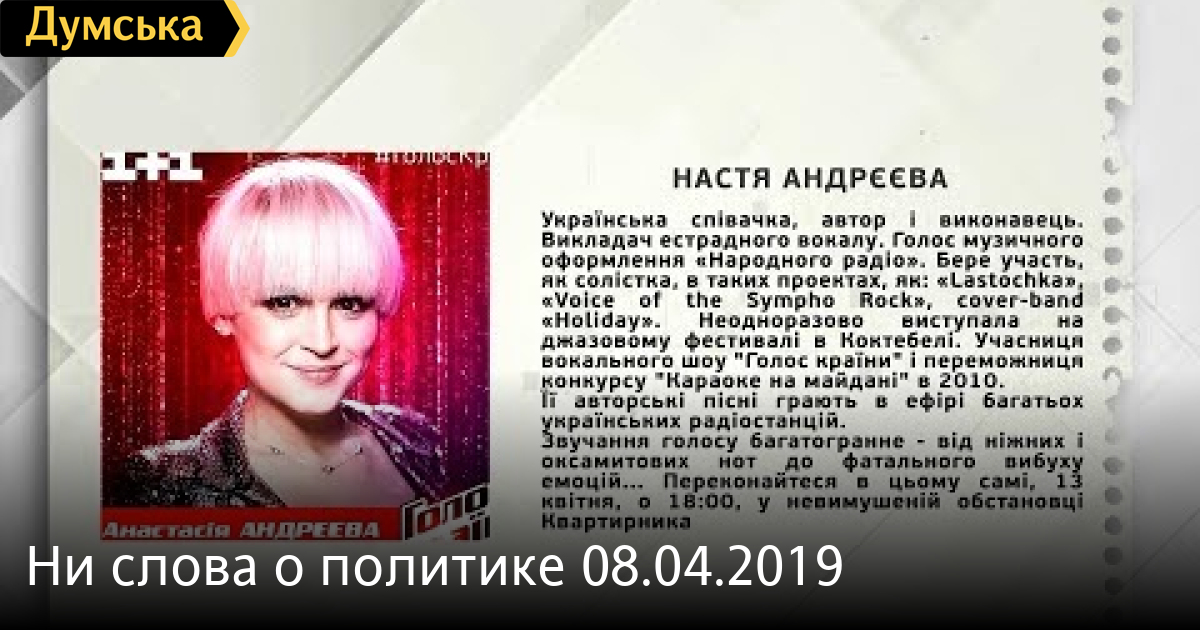 Анастасия Андреева, певица СМЕРТЬ РОССИЙСКИМ ОККУПАНТАМ! Заметили ошибку? Выделяйте слова с ошибкой и нажимайте control-enter Думская ТВ. Ни слова о политике (День на Думской):