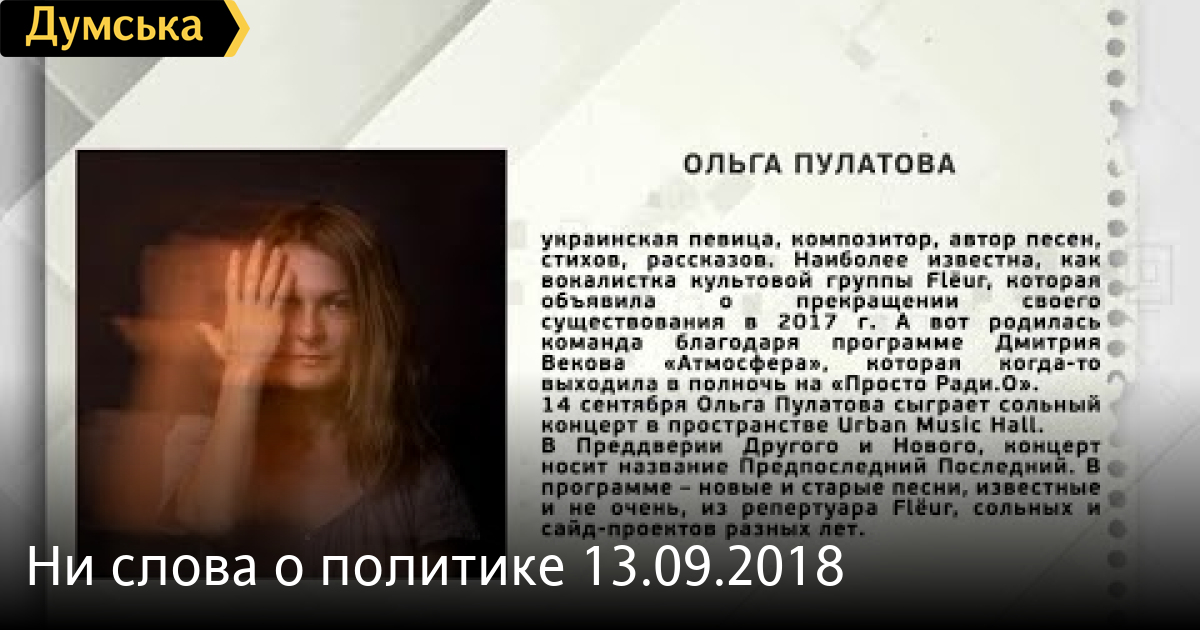 Ольга Пулатова — певица, композитор СМЕРТЬ РОССИЙСКИМ ОККУПАНТАМ! Заметили ошибку? Выделяйте слова с ошибкой и нажимайте control-enter Думская ТВ. Ни слова о политике (День на Думской):