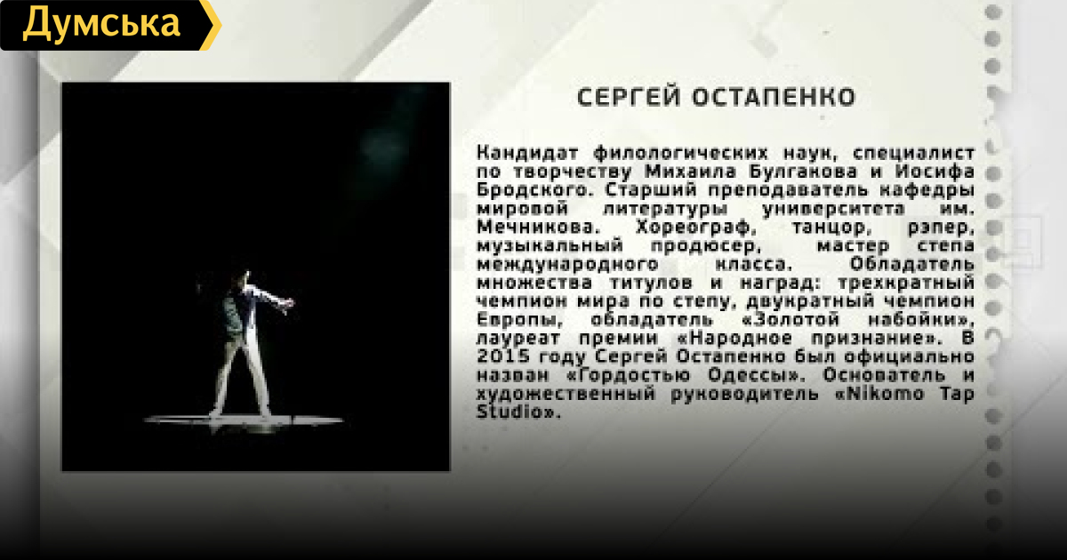 Сергей Остапенко — кандидат филологических наук СМЕРТЬ РОСІЙСЬКИМ ОКУПАНТАМ! Помітили помилку? Виділяйте слова з помилкою та натискайте control-enter Думская ТВ. Ни слова о политике (День на Думской):