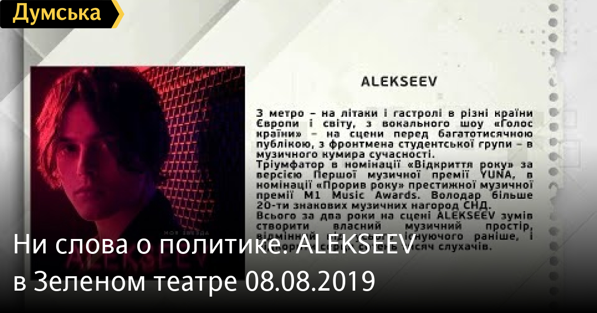 ALEKSEEV в Зеленом театре 23 августа СМЕРТЬ РОССИЙСКИМ ОККУПАНТАМ! Заметили ошибку? Выделяйте слова с ошибкой и нажимайте control-enter Думская ТВ. Ни слова о политике (День на Думской):