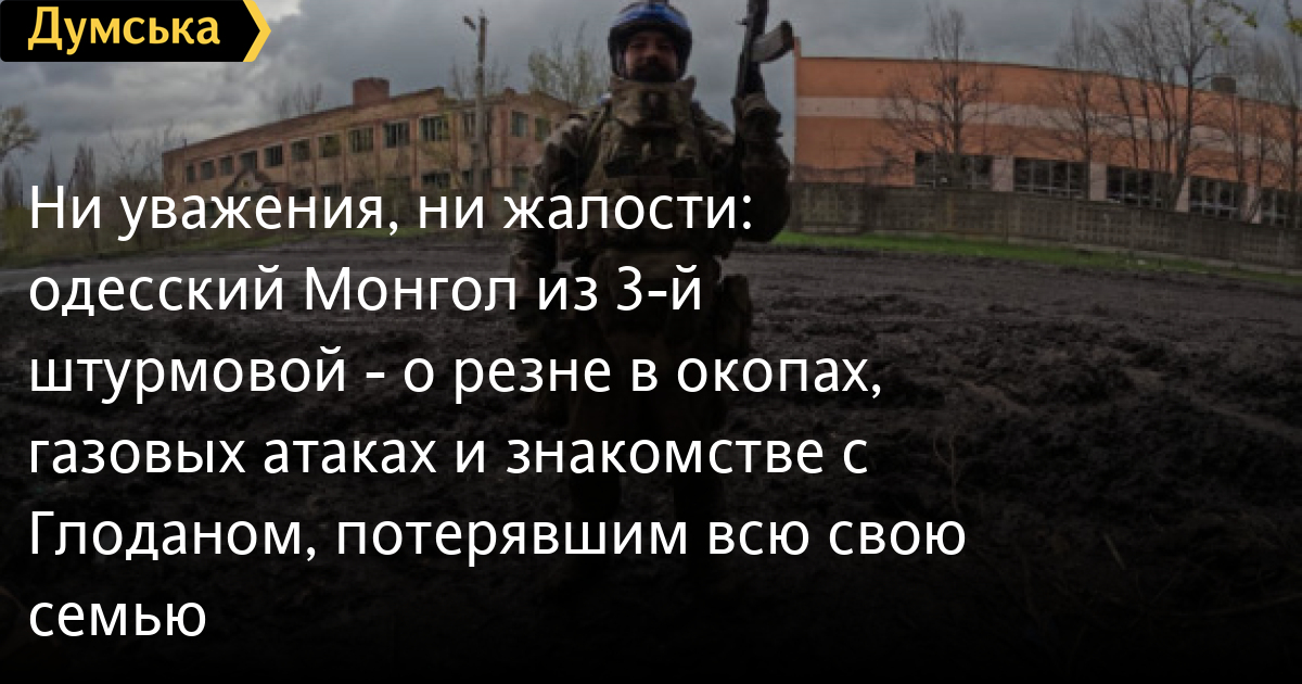 Ни уважения, ни жалости: одесский Монгол из 3-й штурмовой — о резне в окопах, газовых атаках и знакомстве с Глоданом, потерявшим всю свою семьюИсторики подсчитали, что в ходе наиболее ожесточенных сражений Второй мировой средняя продолжительность жизни пехотинца на передовой составляла 15-20 минут. Понятно, что касалось это не каждого, но в целом плюс-минус было так. Полномасштабная война в Украине тоже сопровождается колоссальными потерями сторон, особенно среди пехоты, но средние показатели выживаемости на поле боя все же не такие — мы бы сказали, совсем не такие. И тем не менее на «нуле» страшно, очень страшно, смертельно страшно Ваша редакция считает, что все украинские пехотинцы, которые пробыли хотя бы сутки в этом ужасе, достойны высоких государственных наград, всяческих льгот и пожизненной благодарности со стороны народа и государства. Склоните перед ними головы! Чтобы хоть как-то понять, каково это, мы пообщались с ветераном 3-й штурмовой Дмитрием Гудзем, позывной Монгол, получившим Золотой крест за успешную атаку в районе Хромового на донецком направлении. Хромово (до 2016 г. Артемовское) — поселок в Бахмутской городской громаде Бахмутского района Донецкой области. Это западный пригород Бахмута. Население до войны — чуть меньше 1000 человек. С севера и запада от поселка — холмы. По-военному — господствующие высоты. Был сквер «Дружба», детский сад «Улыбка», кладбище и отделение «Новой почты», скверик, пару магазинчиков и милая кафешка. Бои за местечко велись с конца 2023 года, в 2024-м оно было полностью оккупировано врагом. Тот день день Монгол запомнил на всю жизнь. Уже опытного и обстрелянного бойца командование наконец-то сочло готовым, разрешив участвовать в полноценном штурме. На него одессит Дмитрий Гудзь пошел первым в составе группы из восьми солдат. Задача — очистить от противника линию окопов. «На эмках (американские БТР M113) выдвигаемся на позиции, спешиваемся и по нашим траншеям, занятым Нацгвардией, добираемся до дороги. Работает наша арта, потом перебегаем ее, и вот мы в окопах у пидоров (простите за мат, то большинство украинских военных именно так именует врага, впрочем, это взаимно, — Ред.). Над нами всегда висит наша «птичка» (разведывательный дрон), у каждого второго номера рация. Командир взвода подробнейше информировал, где противник, через сколько метров, и мы понимали, что делать конкретно в каждую секунду боя. Первый мой контакт с противником: смотрю, в метрах двадцати поднимается голова, каска в пикселе, я смотрю на чувака и недоумеваю, неужели наш? Смотрю на него, а он на меня какое-то мгновение. И он тут начинает лопотать по своей радейке: «Вижу укропа, вижу укропа в синей каске». И понеслось. Вскоре его не стало, как и всех их». В бою, который продолжался с раннего утра до четырех вечера, два взвода 3-й выполнили поставленную задачу и ликвидировали около 60 солдат противника, не потеряв ни одного своего. Нескольких воинов легко ранило. Все основательно постреляли, все видели глаза врага, что редкость в современной войне. Взрывы гранат, автоматные очереди, запах гари с оттенком гниющей мертвечины, берцы скользят по откосам Дмитрий Гудзь действовал умело и напористо, за что и получил крест. От его руки полегло пятеро оккупантов. «Меня иногда спрашивают, а что ты чувствуешь по отношению к противнику? — говорит защит
