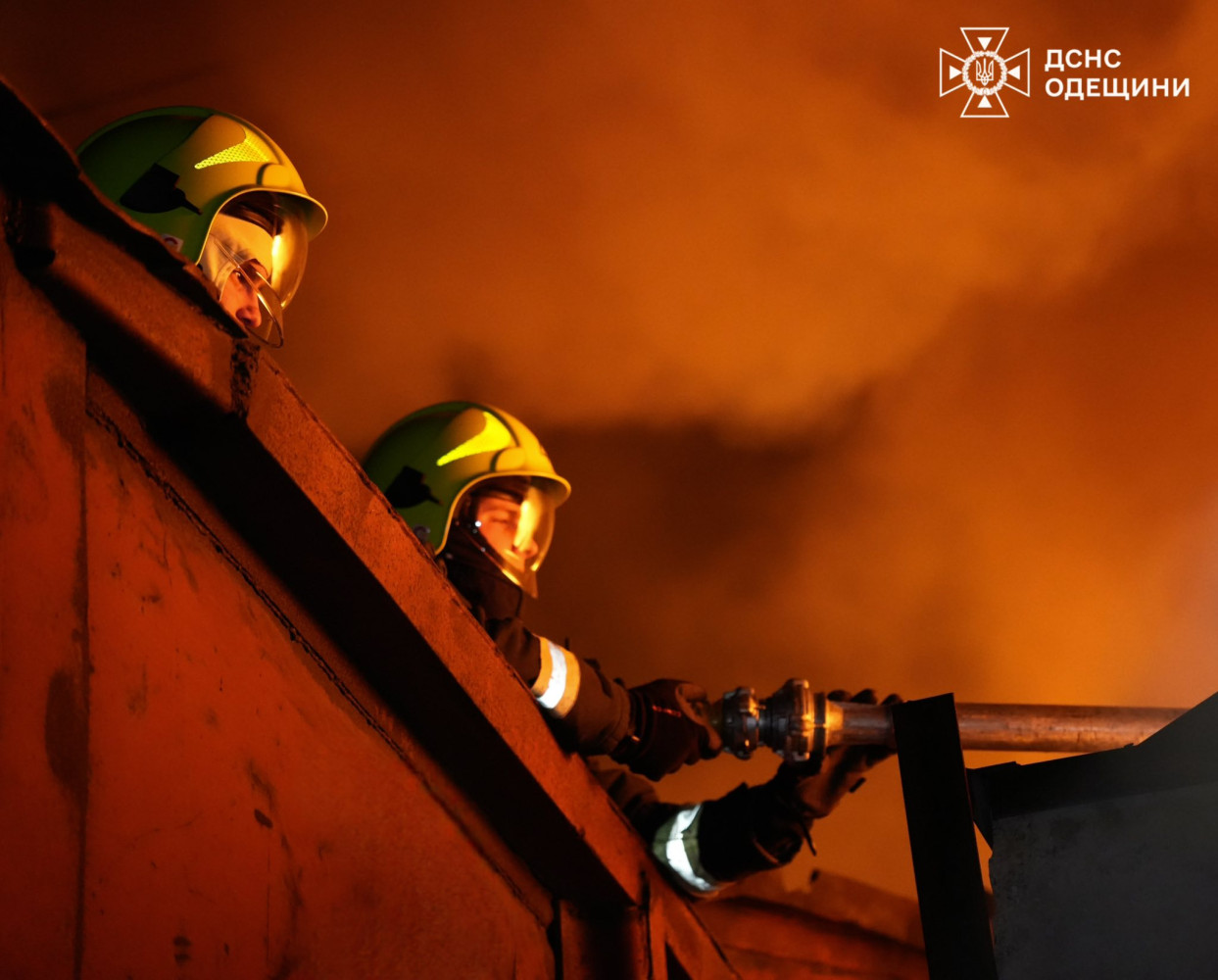 В этом помещении был пожар вследствие атаки. Спасатели до сих пор проливают.