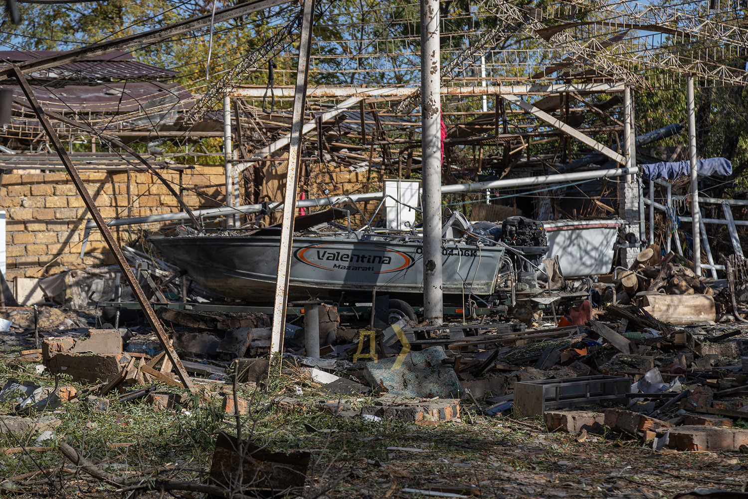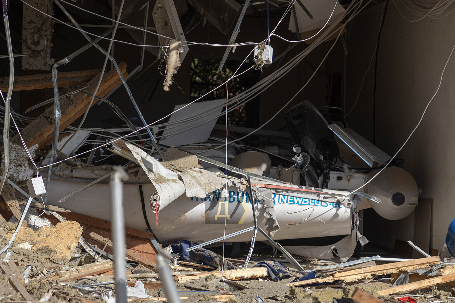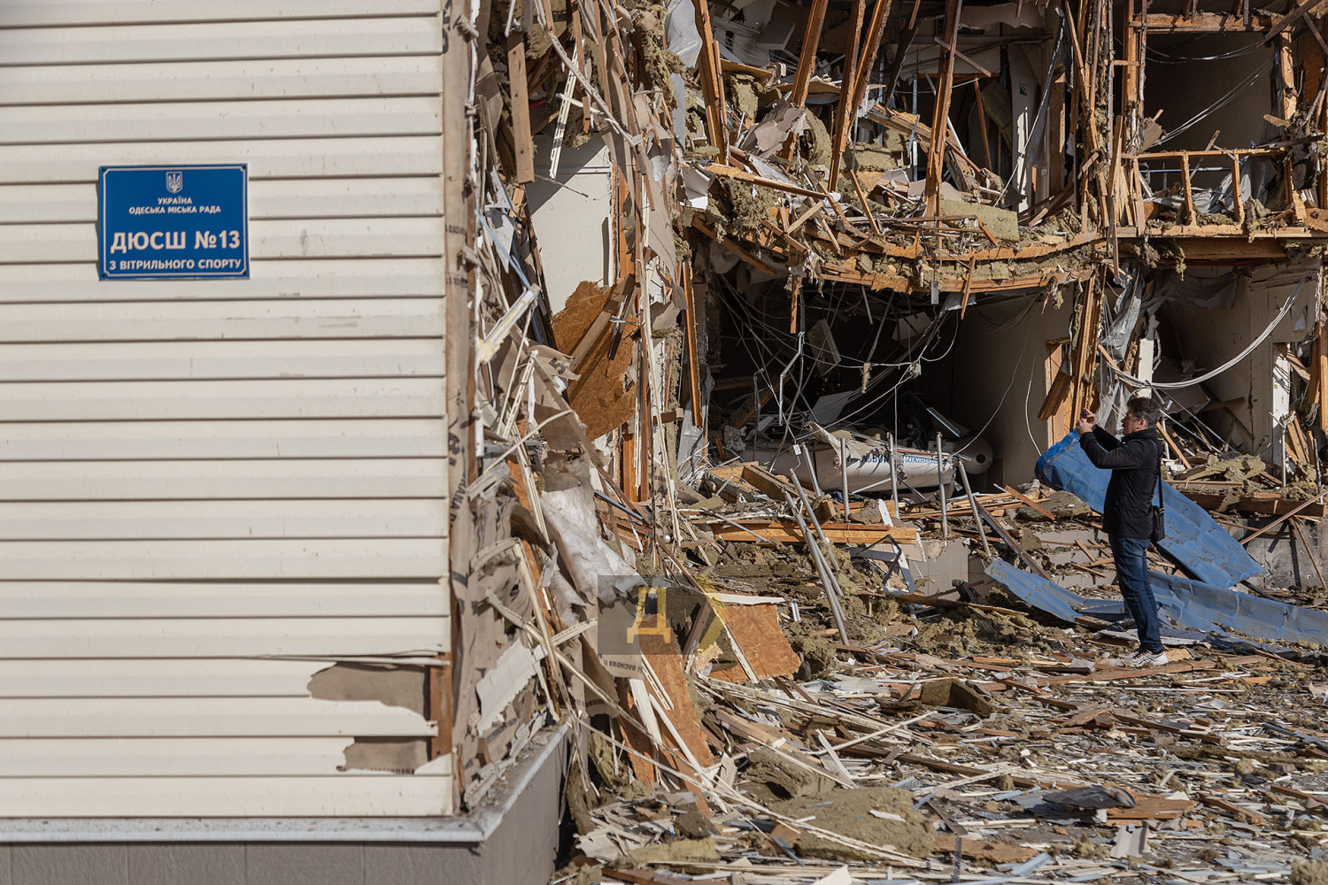 Як повідомляє кореспондент «Думської», уламки «балалайки» впали за три метри від ганку будівлі. Вибуховою хвилею зірвало весь фасад і, судячи з усього, пошкодило навіть несучі конструкції будівлі. Уламки фасаду і профнастилу валяються навіть у воді в акваторії яхт-клубу.
