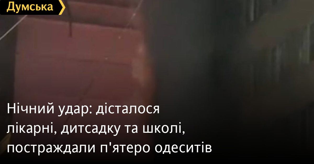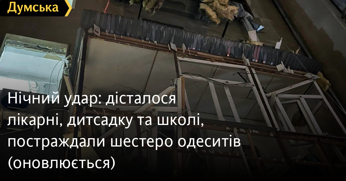 Нічний удар: дісталося лікарні, дитсадку та школі, постраждали шестеро одеситів (оновлюється)Шестеро людей постраждали внаслідок двох хвиль атаки російських дронів. Як повідомили у міській військовій адміністрації, у центрі Одеси пошкоджено житлові будинки та об'єкти соціальної сфери. Зокрема, дісталося лікарні, дитячому садку та школі. Розгорнуто оперативні штаби, на місці працюють комунальні служби. Потерпілим надають усю необхідну медичну допомогу. ОНОВЛЕНО О 8:50. Кількість постраждалих зросла з п'яти до шести. Як повідомили в обласній військовій адміністрації, пошкоджено енергетичні об’єкти, багатоквартирні житлові будинки та об’єкти соціальної сфери: лікарня, дитячий садок, луна-парк, ліцей, фітнес-центр, а також приватний транспорт. Серед постраждалих — люди віком від 35 до 68 років. Двоє із травмами середнього ступеня важкості госпіталізовані, ще четверо медичну допомогу отримали на місці. Усі перебувають під наглядом лікарів. ОНОВЛЕНО ОБ 11:45. Вночі ворожа атака суттєво пошкодила два енергетичні об’єкти ДТЕК. Як заявили в компанії, через обстріли наразі без електропостачання залишаються близько 47 тисяч родин. «Руйнування значні, відновлення потребує часу», — ідеться в офіційному повідомленні. СМЕРТЬ РОСІЙСЬКИМ ОКУПАНТАМ! Помітили помилку? Виділяйте слова з помилкою та натискайте control-enter |