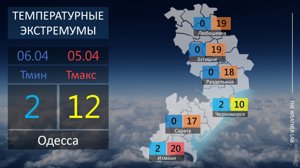 За останню добу в регіоні зафіксовано екстремальні різниці температур. Майже 20°C, причому як на півдні, так і на півночі області. А ось в Одесі за добу похолодало лише на 10°C. Такі дані наводить телеграм-канал THE WEATHER LAB.