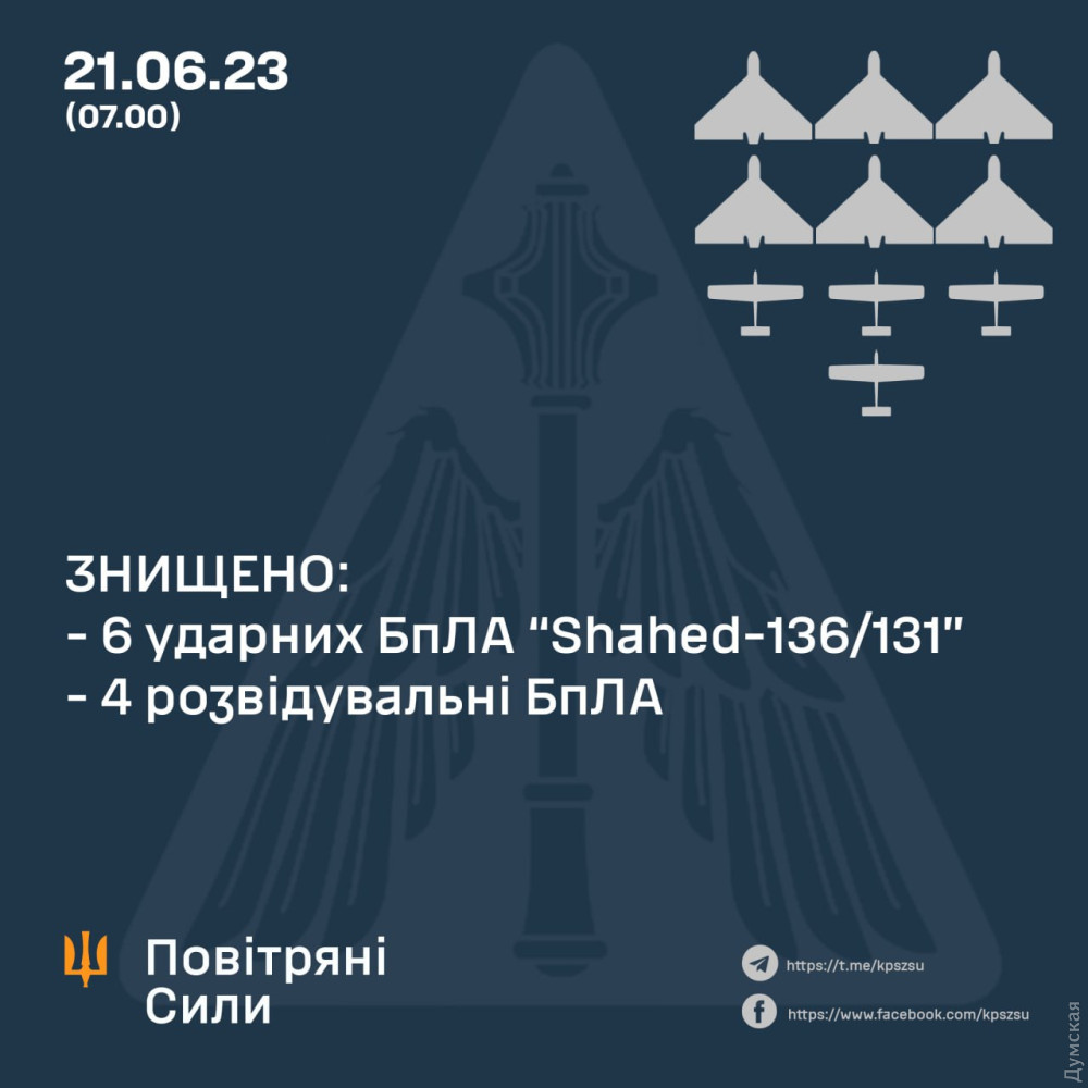 Шість дронів Shahed-136 знищила ППО вночі 21 червня. У Повітряних силах Збройних сил України повідомили, що окупанти запустили шість дронів із північного напрямку — усі вони були уражені. Також, за уточненими даними, 20 червня зенітники збили чотири ворожі розвідувальні БПЛА різних типів. СМЕРТЬ РОСІЙСЬКИМ ОКУПАНТАМ! Помітили помилку? Виділяйте слова з помилкою та натискайте control-enter |
