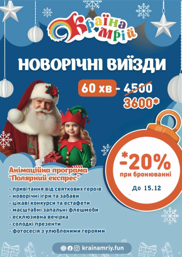Новорічне диво та атмосфера свята: Країна Мрій запрошує маленьких гостей (на правах реклами)Свята наближаються! У програмі: Подаруйте дітям незабутнє свято у найчарівніший час року! Звертатися з питаннями можна за телефоном +380 50 331 77 15. СМЕРТЬ РОСІЙСЬКИМ ОКУПАНТАМ! Помітили помилку? Виділяйте слова з помилкою та натискайте control-enter |