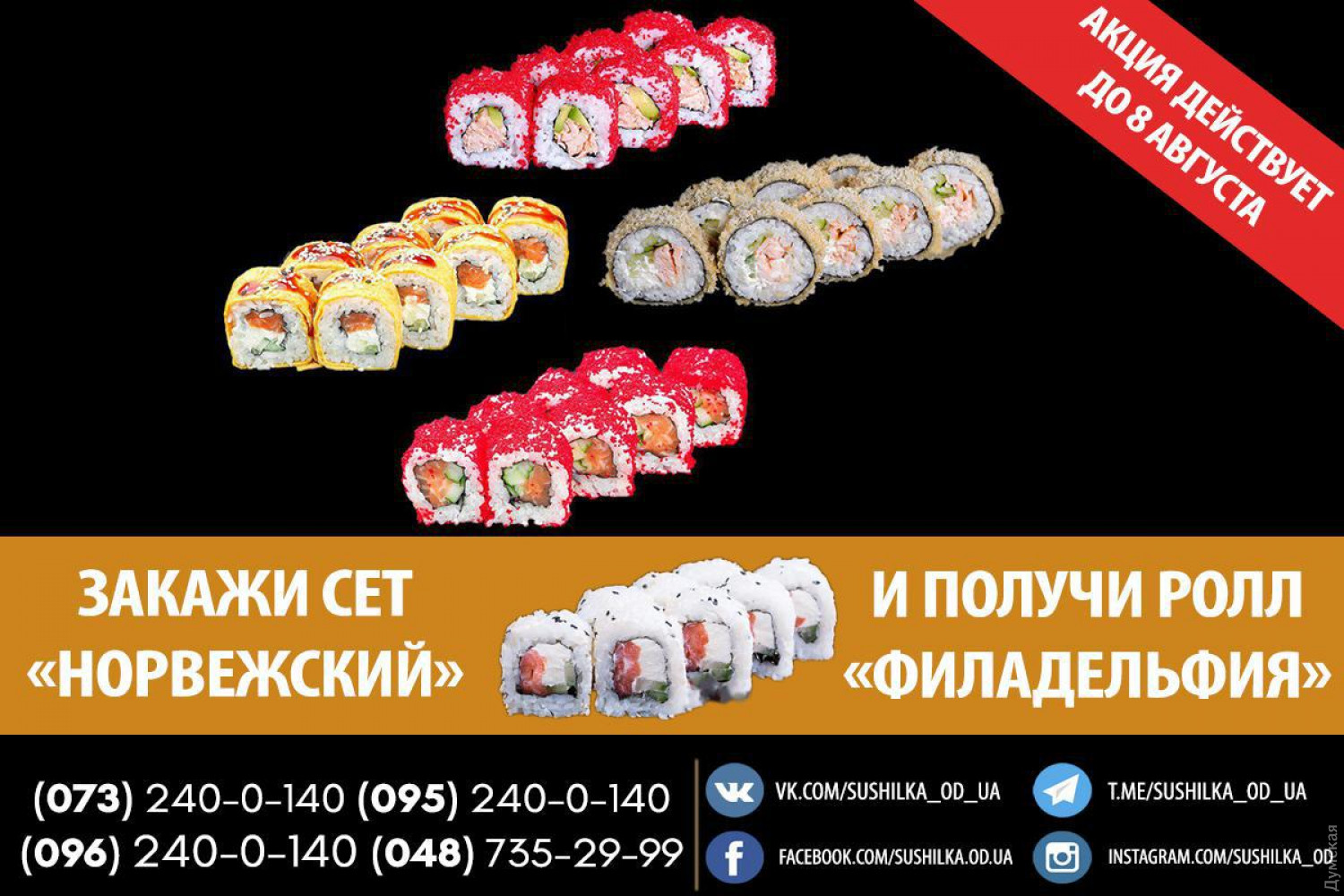 Новые акции: “Сушилка” дарит ролл “Филадельфия” за заказ сета (на правах рекламы)До 8 августа включительно в «Сушилке» действует вкусная акция, в рамках которой каждый, кто закажет новый сет «Норвежский», получит в подарок ролл «Филадельфия». Таким образом, всего за 400 гривен вы получите 40 кусочков весом 1,2 кг. Также сервис добавил новый сет «Таносими», в состав которого вошли роллы «Момиджи», «Калифорния Унаги», «Икута» и «Ниджи». Заказ можно сделать на сайте sushilka.od.ua или по телефонам: 073-240-0-140; 095-240-0-140; 096-240-0-140; 048-735-29-99. СМЕРТЬ РОСІЙСЬКИМ ОКУПАНТАМ! Помітили помилку? Виділяйте слова з помилкою та натискайте control-enter |