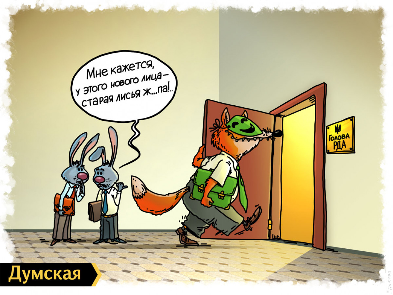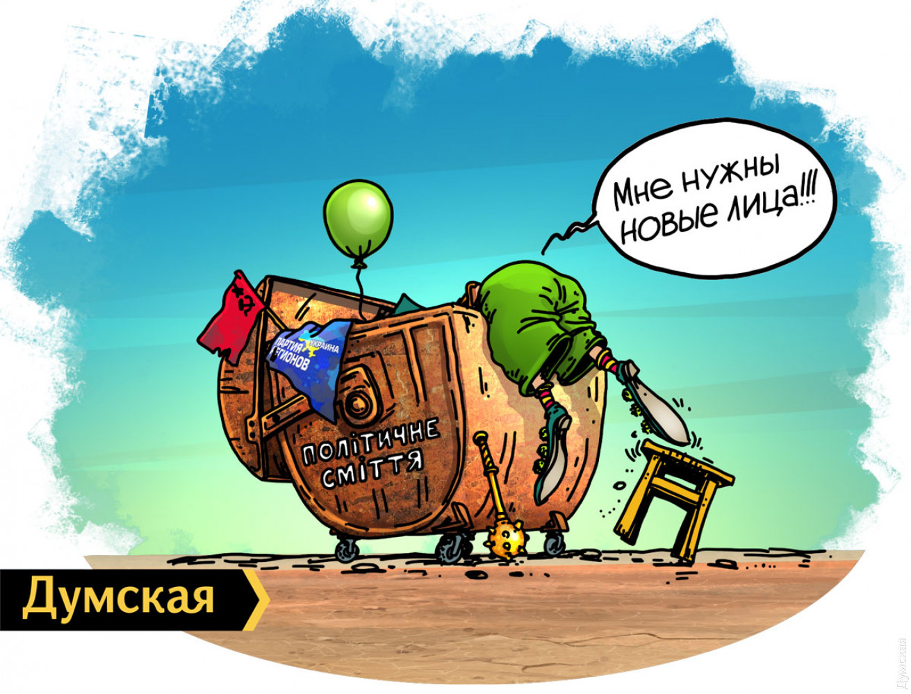 Художники «Думской» Александр Бронзов и Игорь Жеведь отреагировали на последние новости о кадровой политике новой власти сразу двумя карикатурами, которые редакция с радостью публикует. СМЕРТЬ РОСІЙСЬКИМ ОКУПАНТАМ! Помітили помилку? Виділяйте слова з помилкою та натискайте control-enter Новини по цій темі: 23 грудня 2021: Бумеранг: коротко о подозрении Порошенко (карикатура) 24 вересня 2021: Олигархам брошен вызов! (карикатура) 2 червня 2021: "Зеленские деревни" (карикатура) 9 квітня 2021: Бутылочный арт: "Оттакої!" (карикатура) 23 лютого 2021: Одесские пробки: выход есть! (карикатура) 6 листопада 2020: И еще о результатах выборов в Одессе: "Она утонула" (карикатура") |