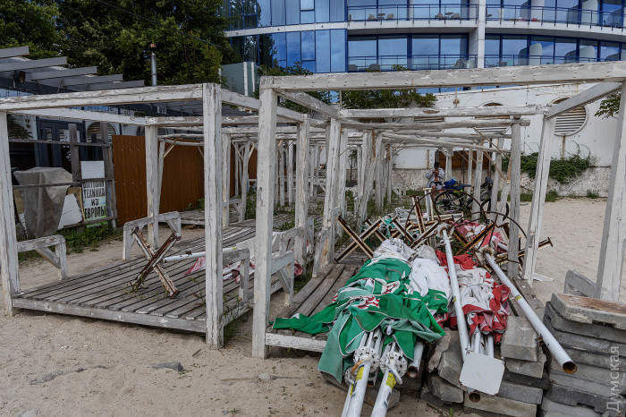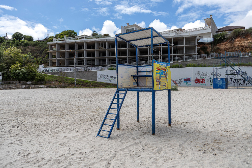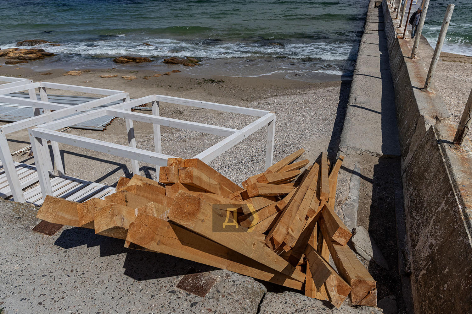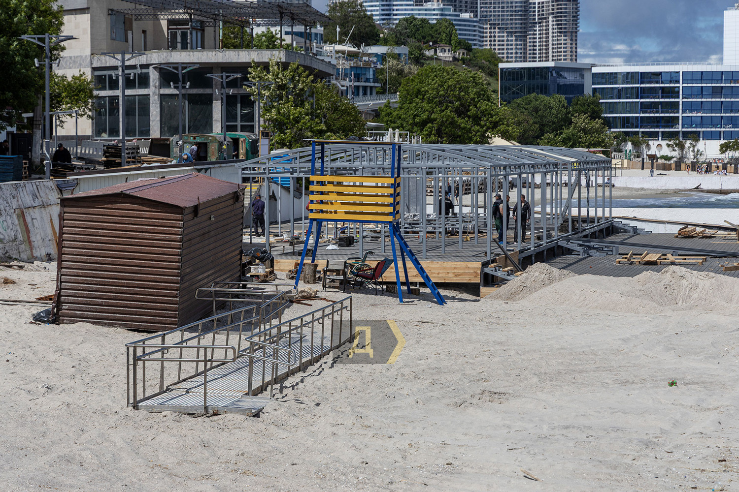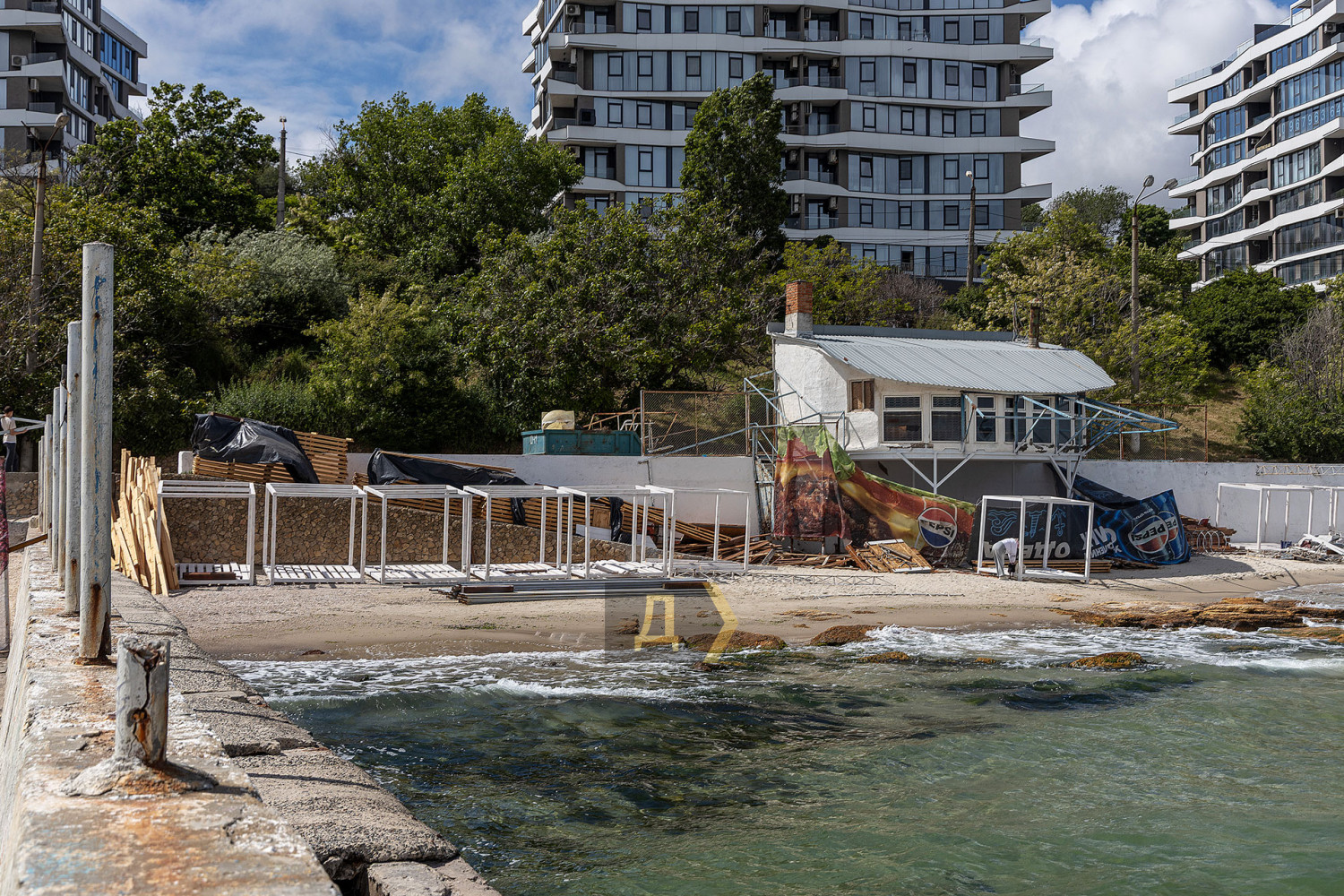 Уже завтра, цієї неділі — літо. Сонце, море, відпочинок. Але чи готові одеські пляжі до сезону? Що там із безпекою берегової лінії, доступністю, інфраструктурою, чистотою? Обласна та міська влада тримає багатозначну паузу і не поспішає оголошувати щасливчиків, які виконали суворі вимоги воєнного часу. «Думська» проінспектувала міські пляжі. Сьогодні до вашої уваги фотозвіт про стан берегової лінії від 10-ї до 16-ї станції Великого Фонтану. Обережно — багато фотографій! Перше, що впадає в око - це безлюдність пляжів, набережних і Траси здоров'я. Зрозуміло, що погода ще не дуже-то й спонукає до водних процедур, але людей зовсім мало — по 2-3 людини на пляж. Є, звісно, і винятки, але про них пізніше. Ми стартуємо з набережної в районі 9-ї станції Фонтану, облаштованої «трудами і турботами» власника замку Гаррі Поттера. Від пляжу тут практично нічого не залишилося: бетонні траверси розбиті, галька змита в море, місцями хвилі б'ються в підпірну стіну і сходинки, що ведуть до пляжу. Кабінки для переодягання, встановлені вздовж стіни, виглядають як після ворожого обстрілу. Величезний пляж «Чайка» також пустельний. Шезлонги, парасольки тут явно ще не затребувані, зате чималу частину займає літній майданчик якогось питного закладу. У кутку пляжу, буквально під апартаментами «Марістелла», які були колись рятувальною станцією, нагромадження бувалого пляжного приладдя. Ми вже писали про те, чому пляжі не можна перетворювати на склади і чим це загрожує, великий матеріал про те тут. Наші журналісти зверталися з цією проблемою до правоохоронців і в КП «Узбережжя Одеси», на жаль, безрезультатно. Зовсім недавно Про те, що формально сезон ще не розпочався, найяскравіше свідчить те, що всі рятувальні вишки в межах 10-16 станції Фонтану порожні. Пляжні комерсанти, при цьому, вочевидь щось знають: більшість кав'ярень відчинені, елітні й не дуже комплекси наводять останній марафет. Вдалося навіть спостерігати як біч-бої просівають пісок. Активно тривають роботи на інклюзивному пляжі 11-го Фонтану: тут закопали настил, яким буде зручно пересуватися на візку, і будують величезний навіс. Прохід тут тимчасово перекрито. У деяких місцях з'явилися нові настили, але заставляти її пляжними меблями орендарі поки не поспішають. Набережна в районі 11-ї станції втомилася за зиму і явно потребує косметичного ремонту. Пляжний комплекс «Public», що став відомим після ось цієї пікантної історії, вже готовий до прийому відвідувачів. Ціни, до речі, торішні: шезлонг обійдеться в 200 гривень, бунгало — в 400. Пляж у районі 13-ї станції, який довгі роки носив назву «Рів'єра», судячи з усього, обзавівся новими суборендарями. Тут встановили величезні гойдалки, до яких шикується черга з інстаграм-інфлюенсерів. На цьому з благоустрою все: у центральній частині пляж абсолютно не доглянутий. Іржавіє старий настил, а з-під піску пробивається травмонебезпечний фундамент якихось будівель. Пляж на 14-й станції в кращому стані. З одного його боку готовий зустріти гостей комплекс Cuba: з іншого — як завжди, переповнений людьми «Кораблик», у центрі відновлюється після нещодавньої пожежі комплекс «Ківі». Тут ми до речі виявили уламки російського безпілотника типу «шахед». Судячи з усього, наше доблесне ППО збило смертоносний дрон у морі під час підльоту до узбережжя. Один із найжвавіших пляжів — спортивний.