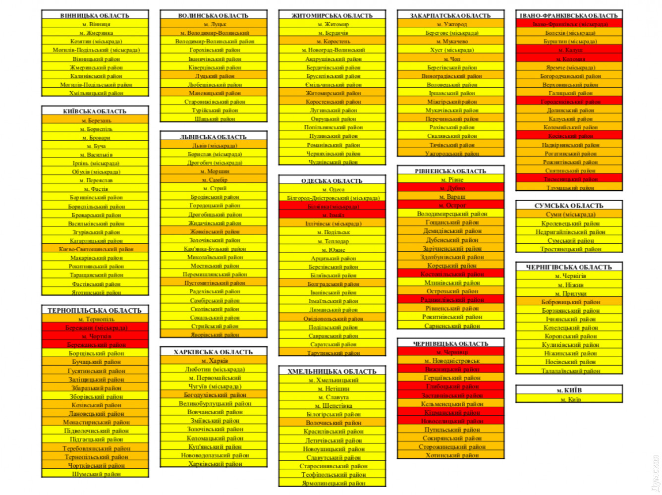 Новые уровни эпидемической опасности по COVID-19: Измаил уже в красной зоне, Черноморск — в оранжевойНовые уровни эпидемической опасности по COVID-19 установила в Украине Государственная комиссия по техногенно-экологической безопасности и чрезвычайным ситуациям. Такое решение она приняла на сегодняшнем внеочередном заседании, сообщили в пресс-службе правительства. Новые ограничения вступят в силу в полночь 31 августа (понедельник) и будут действовать в течение 14 суток, после чего зонирование пересмотрят. В красную зону с максимальными карантинными мерами попали отдельные города и районы пяти областей Украины: Ивано-Франковской, Одесской, Ровненской, Тернопольской и Черновицкой. В Одесской области к «красной» с 17 августа Беляевке присоединился Измаил, который до этого был в оранжевой зоне. В свою очередь в оранжевой зоне оказались город Черноморск, Болградский, Овидиопольский и Тарутинский районы. В Николаевском и Саратском районах уровень эпидемической опасности понижен до желтого. Одесса остается в желтой зоне. В зеленой зоне действуют следующие правила: обязательное ношение масок в общественных местах, проведение массовых мероприятий не более одного человека на 5 кв м, заполненность залов в кинотеатрах и театрах не более 50 процентов, перевозки пассажиров в общественном транспорте по количеству мест для сидения . В желтой зоне, кроме ограничений, действующих в зеленой, ограничено посещение учреждений социальной защиты, где находятся пожилые люди. В оранжевой — запрещена работа предприятий размещения (кроме гостиниц), деятельность развлекательных заведений, ресторанов ночью, плановая госпитализация, детских лагерей; массовые мероприятия могут проводиться из расчета не более одного человека на 20 кв. м. В красной зоне запрещена работа общественного транспорта, учебных заведений, ресторанов и ТРЦ. СМЕРТЬ РОСІЙСЬКИМ ОКУПАНТАМ! Помітили помилку? Виділяйте слова з помилкою та натискайте control-enter Новини по цій темі: 4 березня 2023: "Вакцини-довгожителі", або Як щеплення проти COVID-19 перетворилися в Україні на небезпечний ритуал 27 січня 2023: МОЗ зобов`язали опублікувати договори на закупівлю вакцин проти COVID-19: апеляційний суд задовольнив позов журналіста "Думської" 11 січня 2023: За тиждень в Одесі зафіксовано 159 випадків ковіду 4 січня 2023: За тиждень в Одесі зареєстровано 113 випадків ковіду |