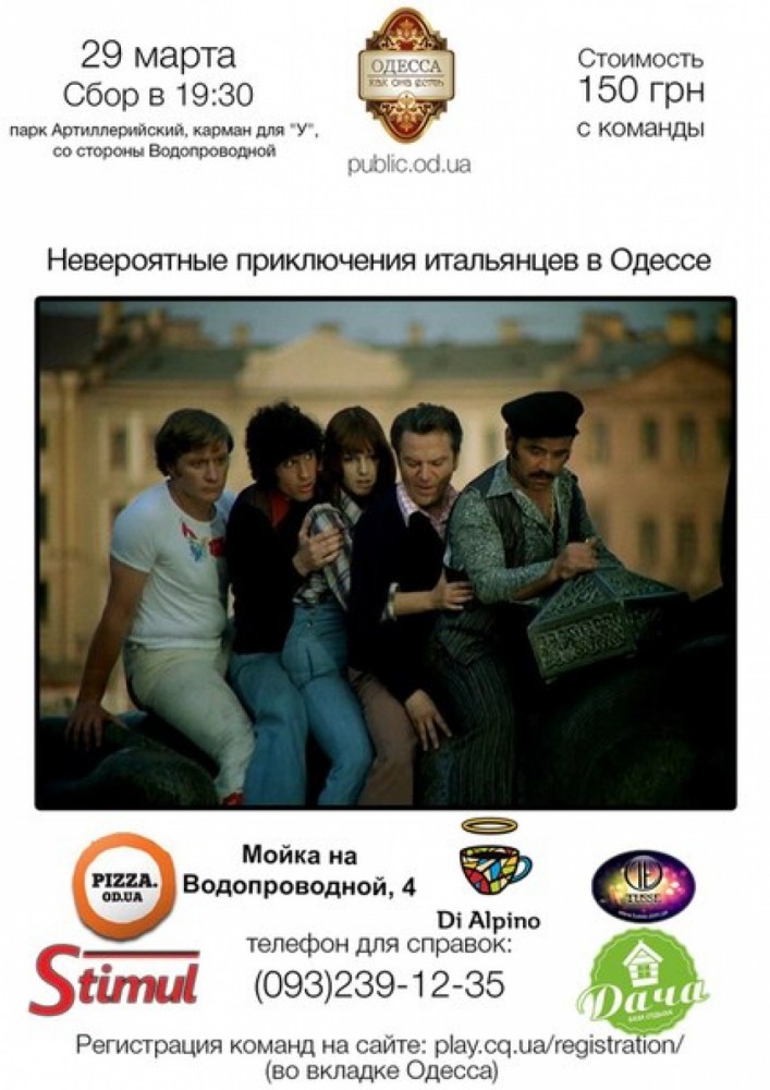 Новый автоквест: «Невероятные приключения итальянцев в Одессе» (на правах рекламы)В субботу, 29 марта, в Одессе пройдет автоквест на тему «Невероятные приключения итальянцев в Одессе». Как сообщают организаторы, сбор участников назначен на 19:30 в Артиллерийском парке, со стороны Водопроводной. «Сити Квест – командная развлекательная игра в реальном мире, во время которой ваша команда будет решать загадки, перемещаться по городу и выполнять разные задания», — отмечается в анонсе. Правила прежние – команду состоят из 3-5 человек. С собой нужно иметь: автомобиль, телефон с интернетом, письменные принадлежности, фонарики, карту города, фотоаппарат, логику и хорошее настроение. Также в игре поможет знание старых названий улиц и скверов. Зарегистрироваться на игру можно здесь. По всем вопросам также можно звонить по телефону 0932391235. СМЕРТЬ РОСІЙСЬКИМ ОКУПАНТАМ! Помітили помилку? Виділяйте слова з помилкою та натискайте control-enter |
