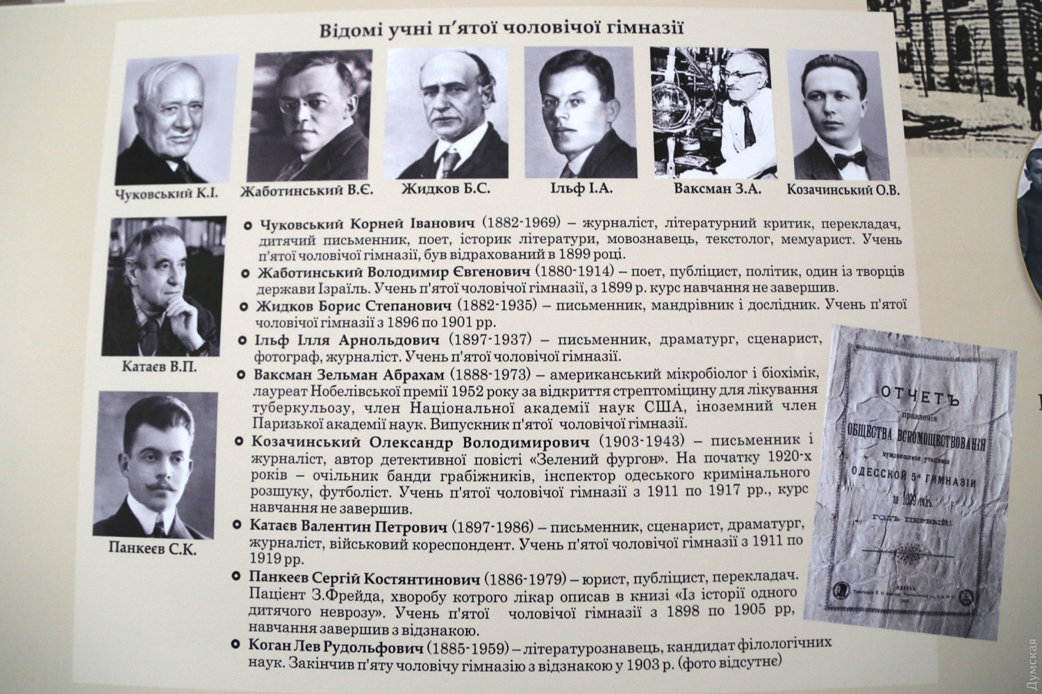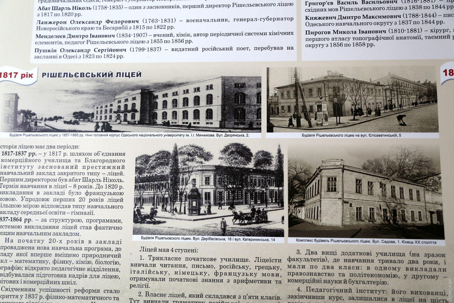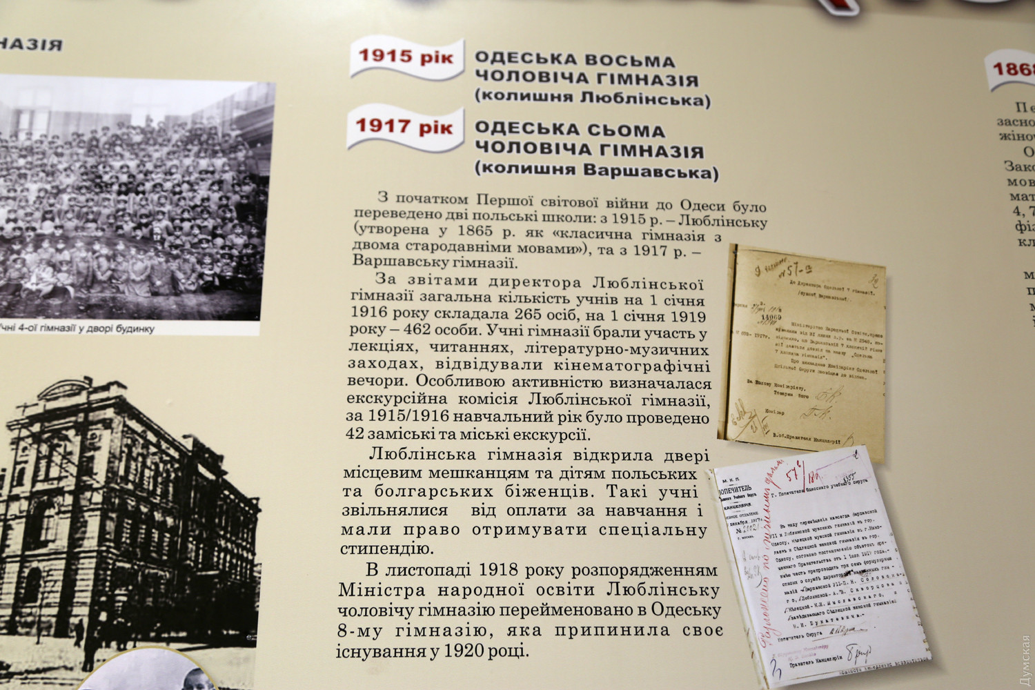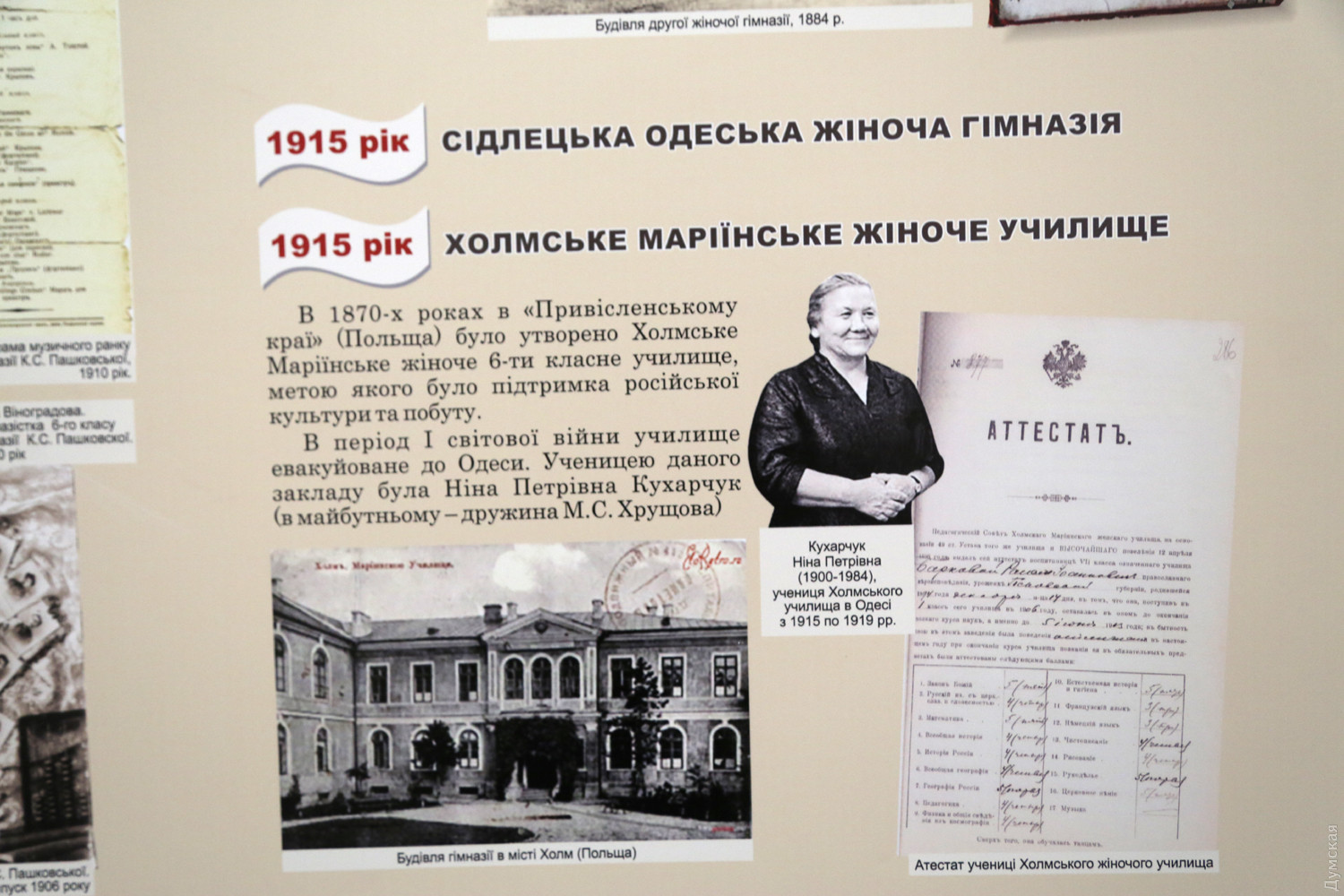 «У нас большая и интересная история. Нам есть что показать и детям, и взрослым, — говорит Елена Линенко. — Например, в годы Первой мировой войны в Одессу переехали две мужских гимназии — Варшавская и Люблинская — и две женские — Холмская гимназия и Седлецкое Мариинское училище. Так вот, Холмскую гимназию окончила в 1919-м Нина Кухарчук, которая потом стала супругой генсека СССР Никиты Хрущева. Не только женские учебные заведения, но и мужские гимназии были оставлены в Одессе навсегда, получив наименование «Седьмая одесская мужская гимназия» (бывшая Варшавская) и «Восьмая одесская мужская гимназия» (бывшая Люблинская)».